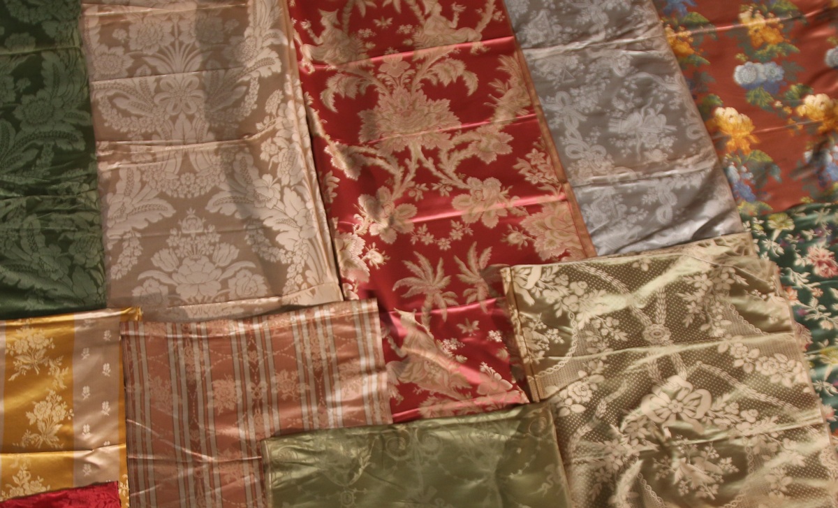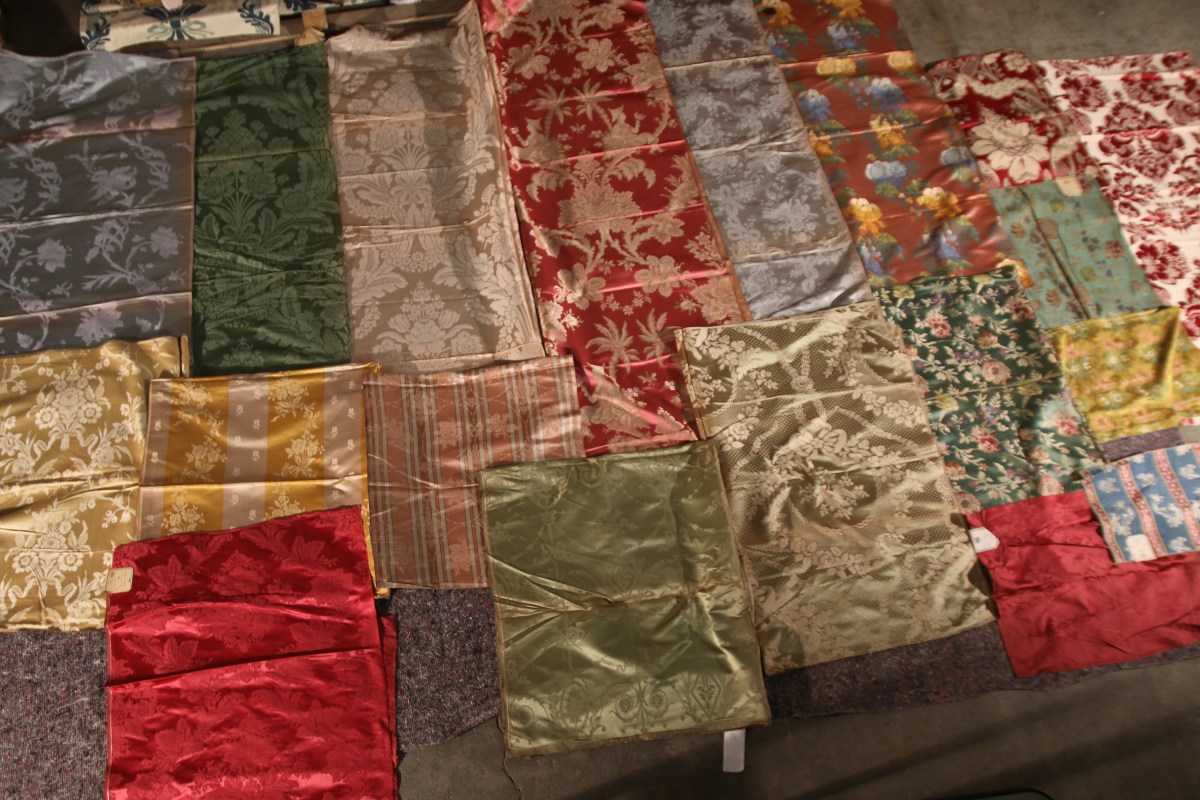 Réunion de DAMAS, LAMPAS, BROCATELLE,, style du XVIIIème siècle, jaune, bleu, vert, rouge et crème, chinois.