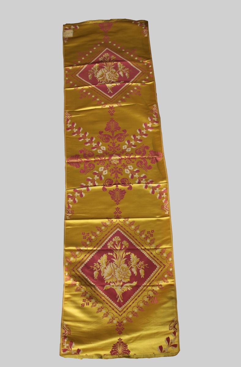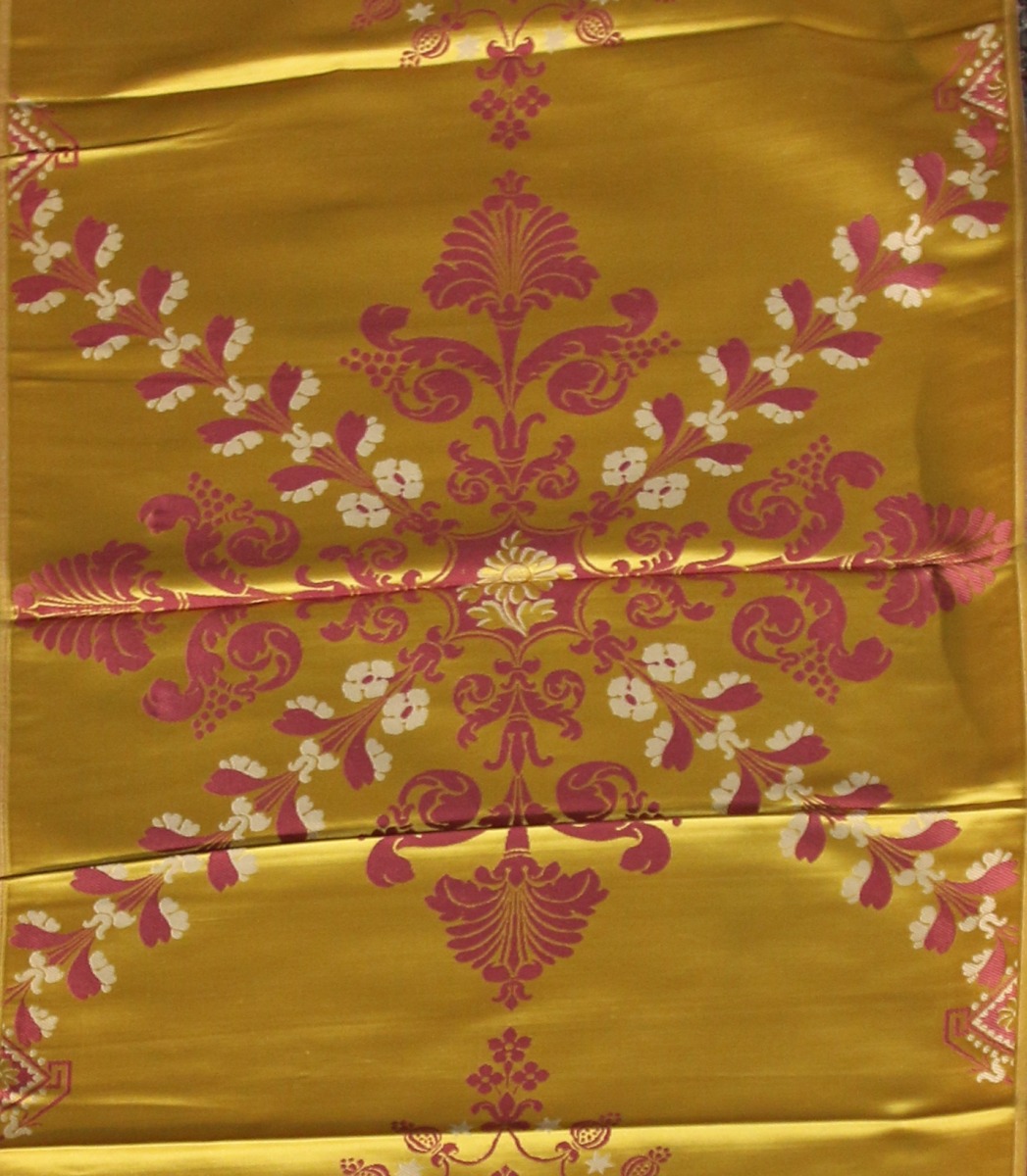 LAMPAS, style Empire, d'après Sériziat à Lyon, fond satin jaune, décor de fleurs dans des losanges roses au milieu d'un réseau de fleurettes, en réplique du tissage du 18 août 1811, pour les chambres à coucher de l'appartement des princes au Palais de Versailles.