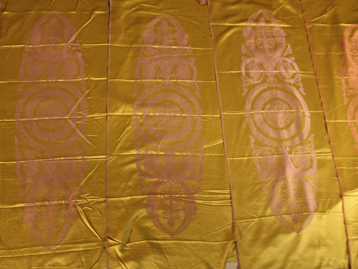 Une laize de lampas tissé à la forme pour un fauteuil, style Empire fond satin jaune, décor rose d'une rosace pour l'assise et de palmes pour le dossier.
