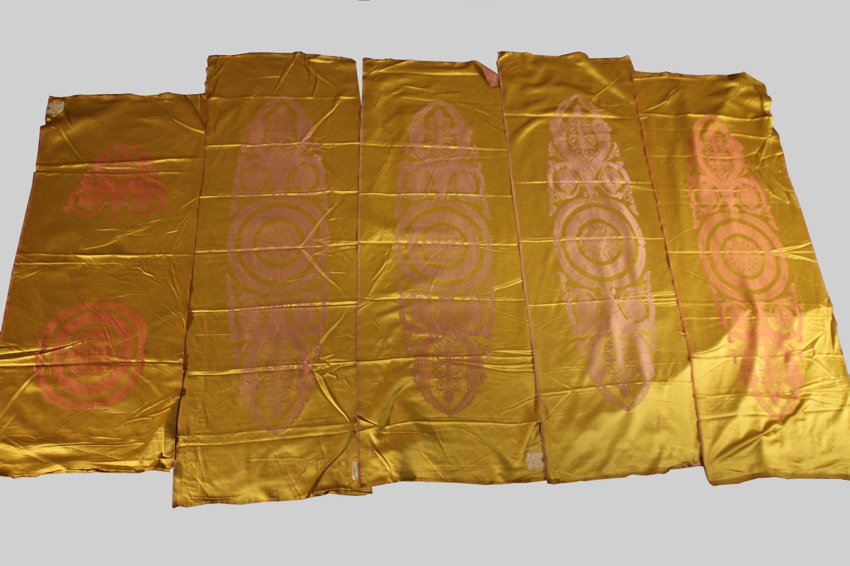 Trois laizes de canapé, fond satin jaune, décor parme d'une rosace entre des palmes.