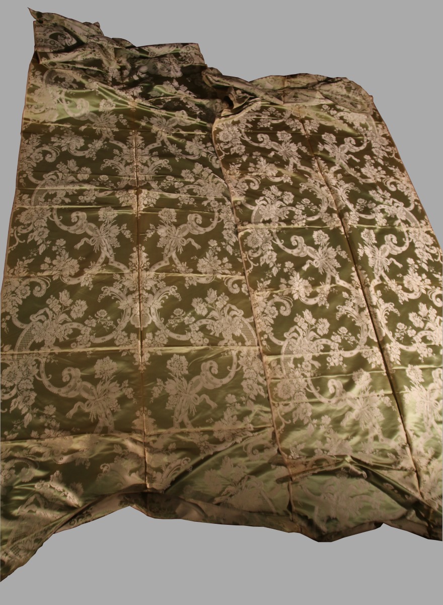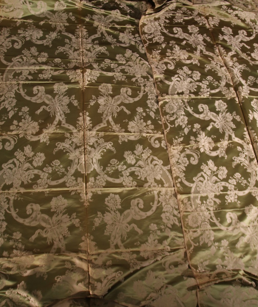 Trois laizes de LAMPAS, style Louis XV, fond sain vert, décor crème effet argent de rubans, rinceaux et fleurs.