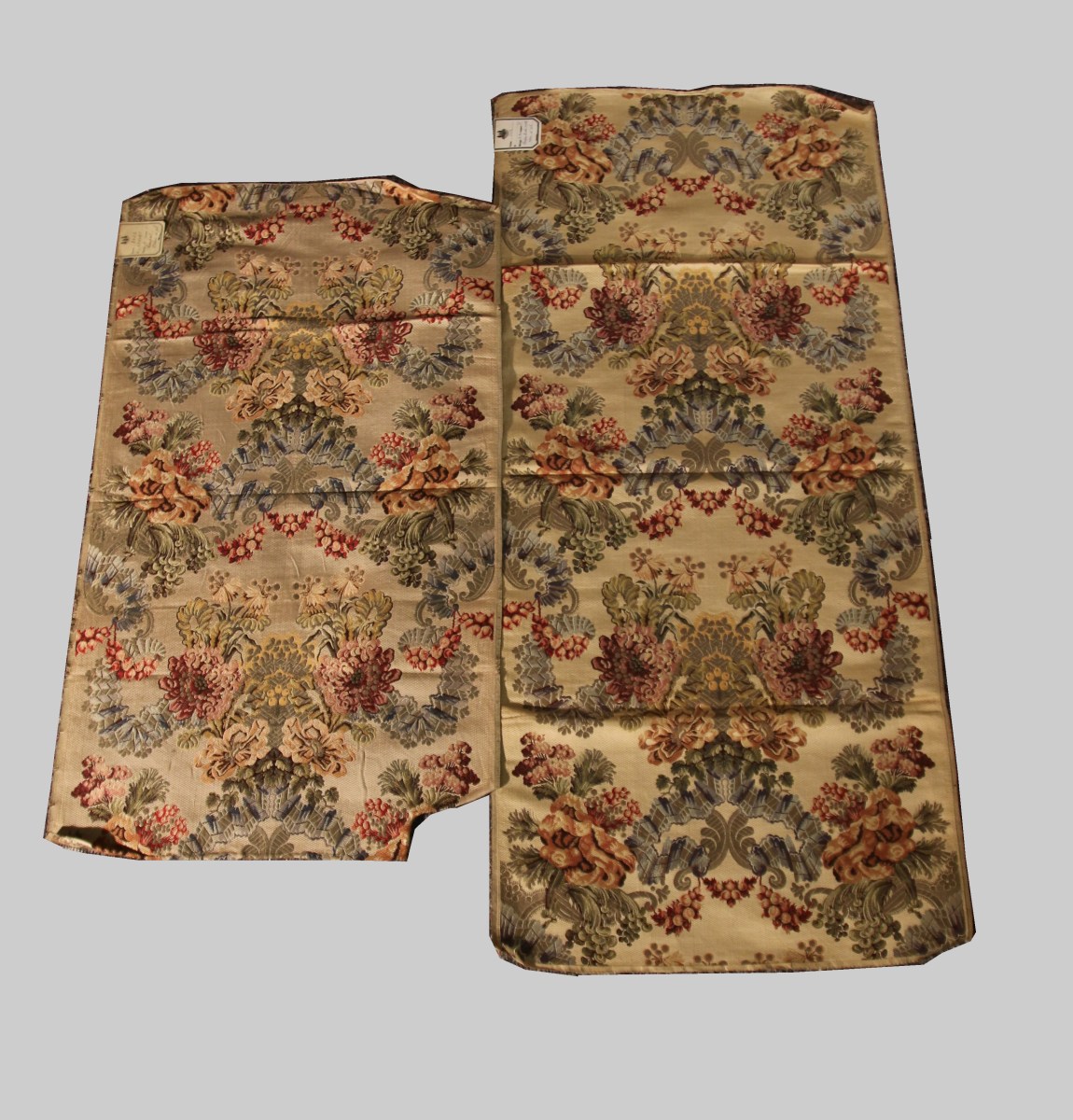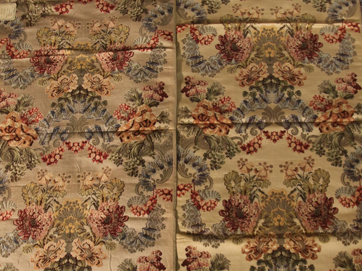 Deux laizes de LAMPAS, style du XVIIIème siècle, fond cannetille crème, décor " naturaliste " en soie polychrome de rubans et fleurs.