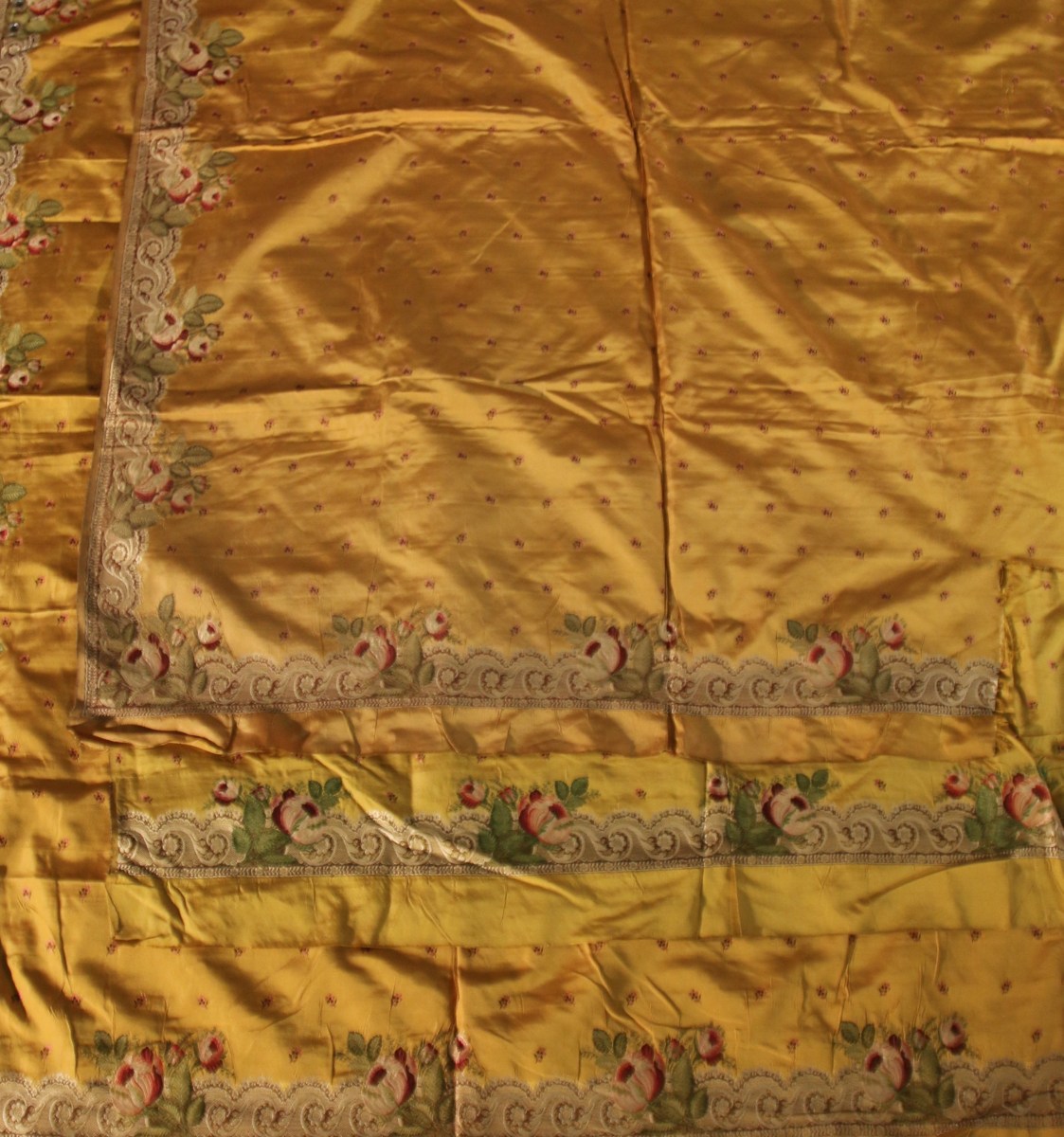 Trois angles de RIDEAUX, style du XVIIIème siècle, faille jaune brochée de fleurettes, bordure brochée de rinceaux et fleurs (trois teintes de jaune).