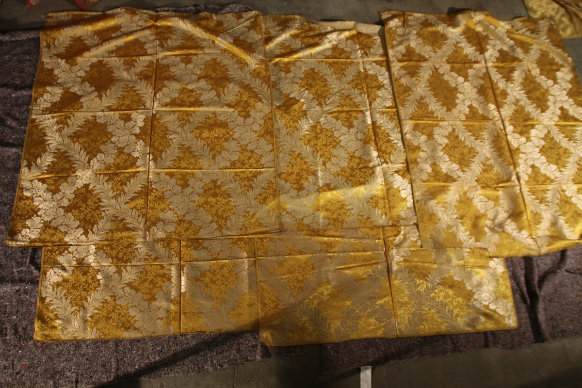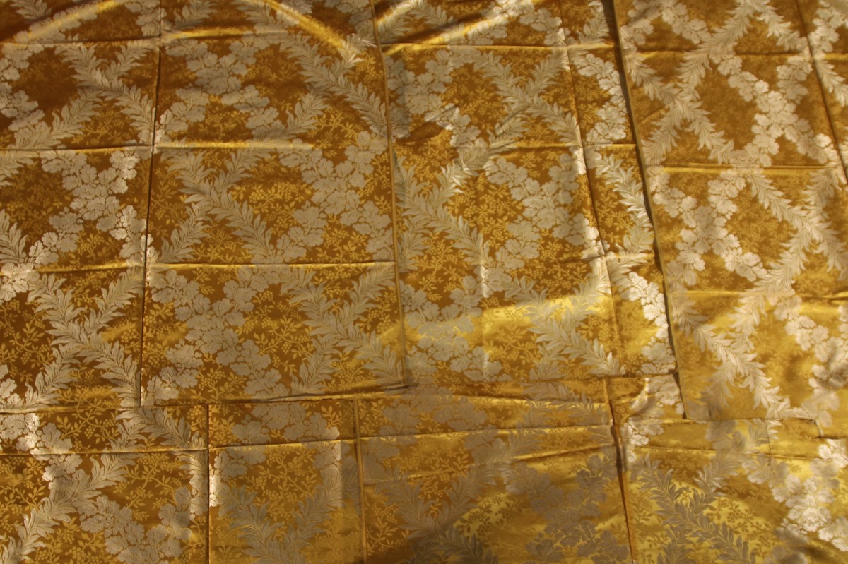 Cinq LAMPAS, style du XVIIIème siècle, en réplique de la commande Charton , en 1772, pour le meuble d'hiver de la chambre de la comtesse d'Artois à Versailles, fond damas satin jaune, décor crème effet argent d'un réseau losangé de branches laurées et feuilles de chênes.
