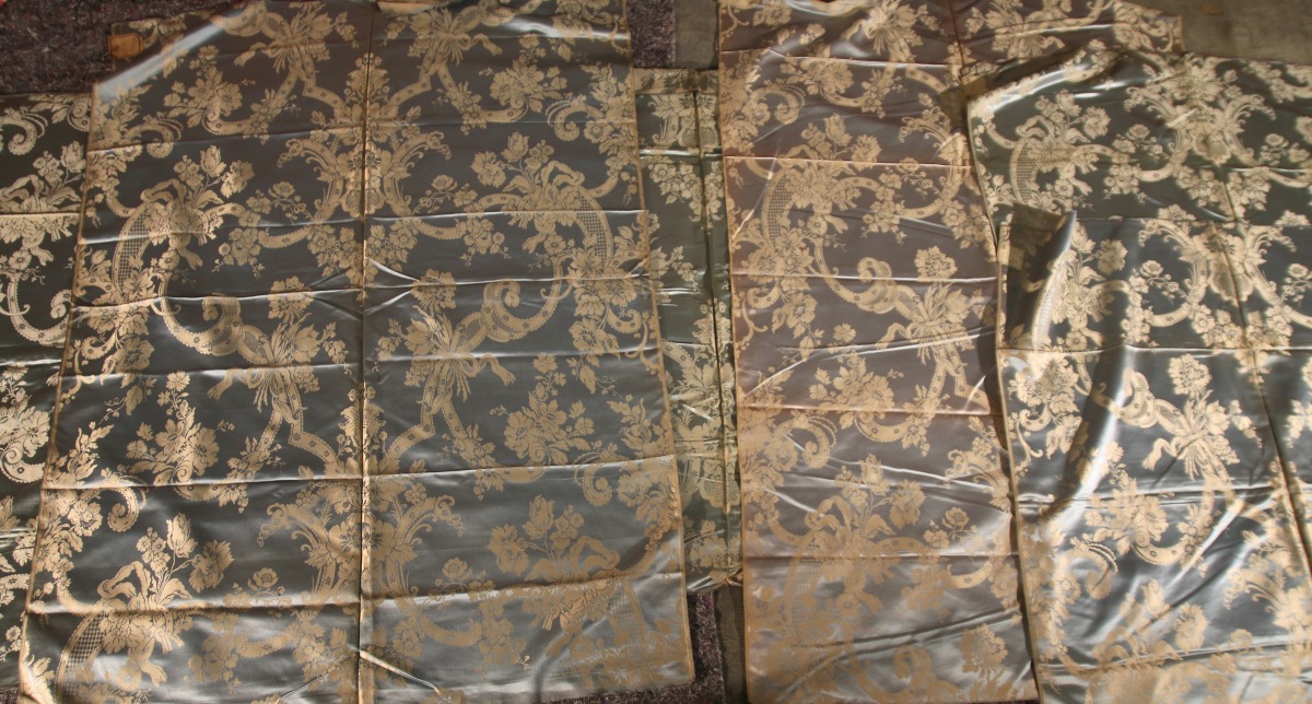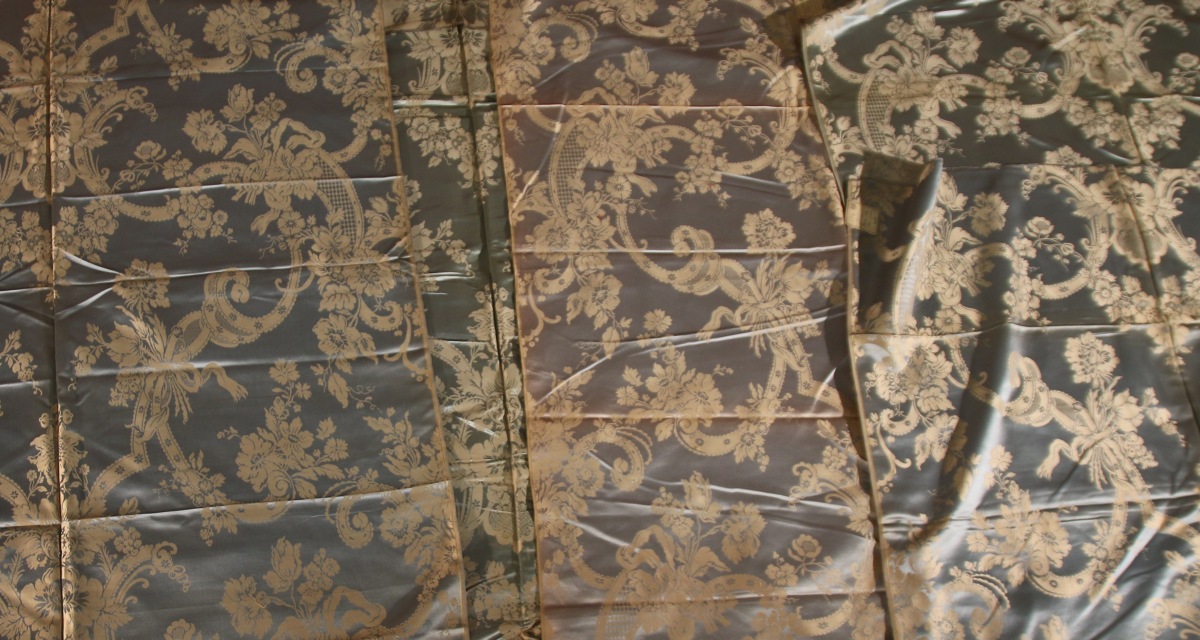 LAMPAS, style du XVIIIème siècle, fond satin bleu, décor crème effet argent de rubans de dentelle en rinceaux et gerbes de fleurs (six panneaux dont avec accroc et un avec décoloration).