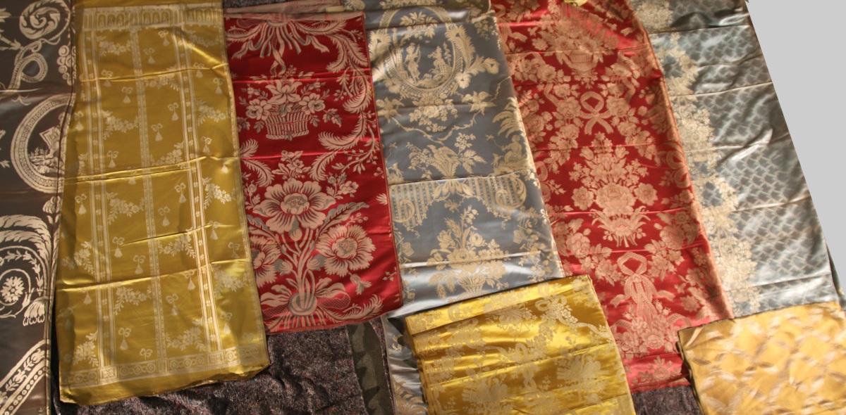 Réunion de DAMAS, LAMPAS, BROCATELLE, style du XVIIIème siècle, jaune, bleu, rouge.