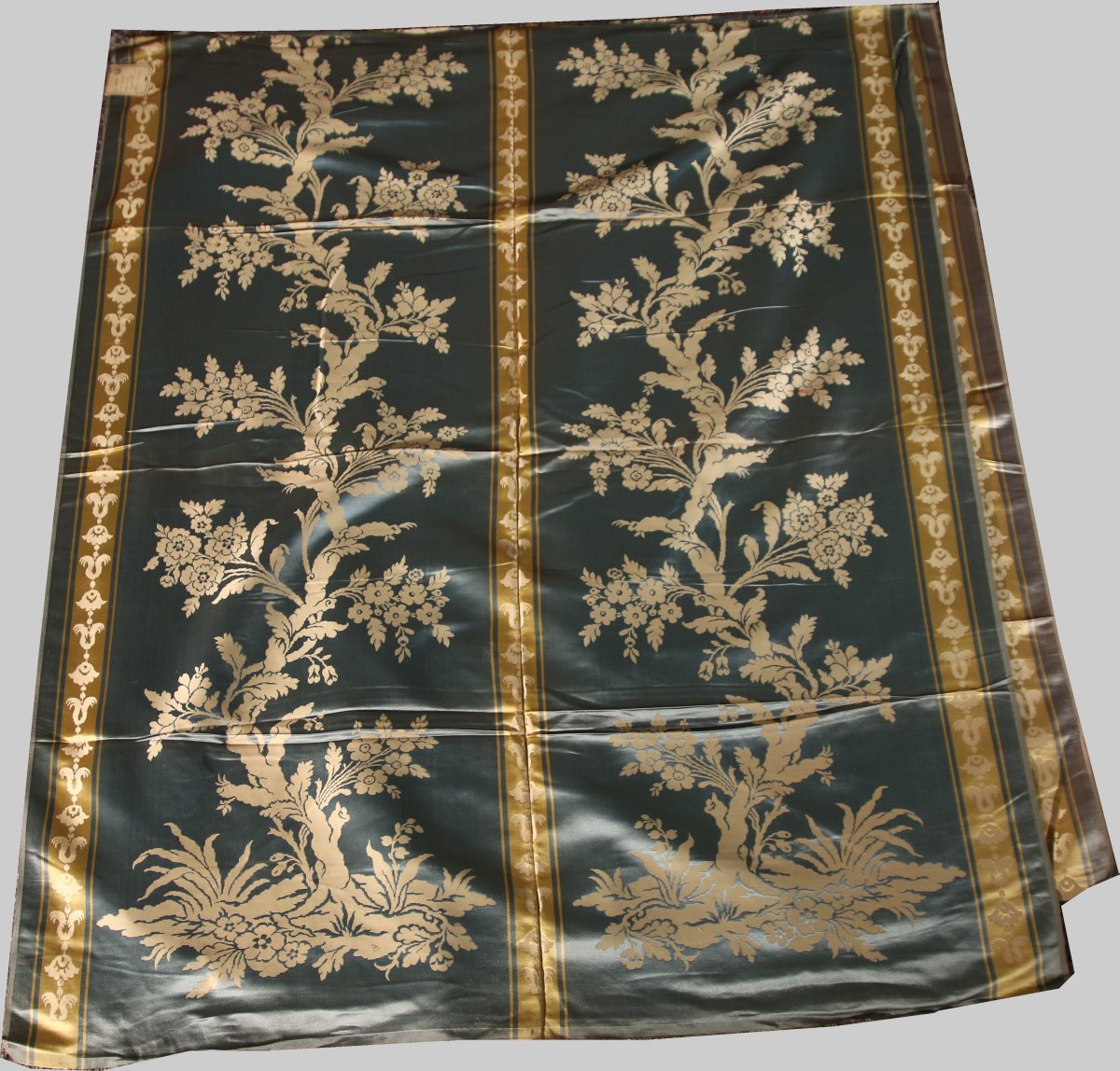 Deux LAIZES de lampas, style du XVIIIème siècle, fond satin bleu, décor crème d'un tronc noueux entre des galons jaunes.
