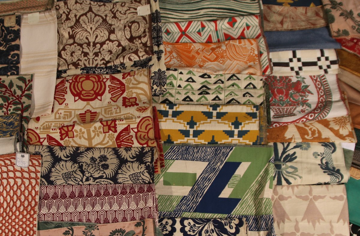 Importante réunion de tissus divers, lampas, brocatelle, broderie, toile de tours, velours, décors variés.