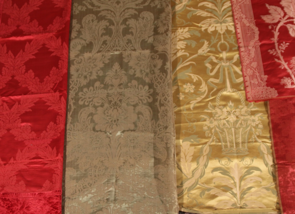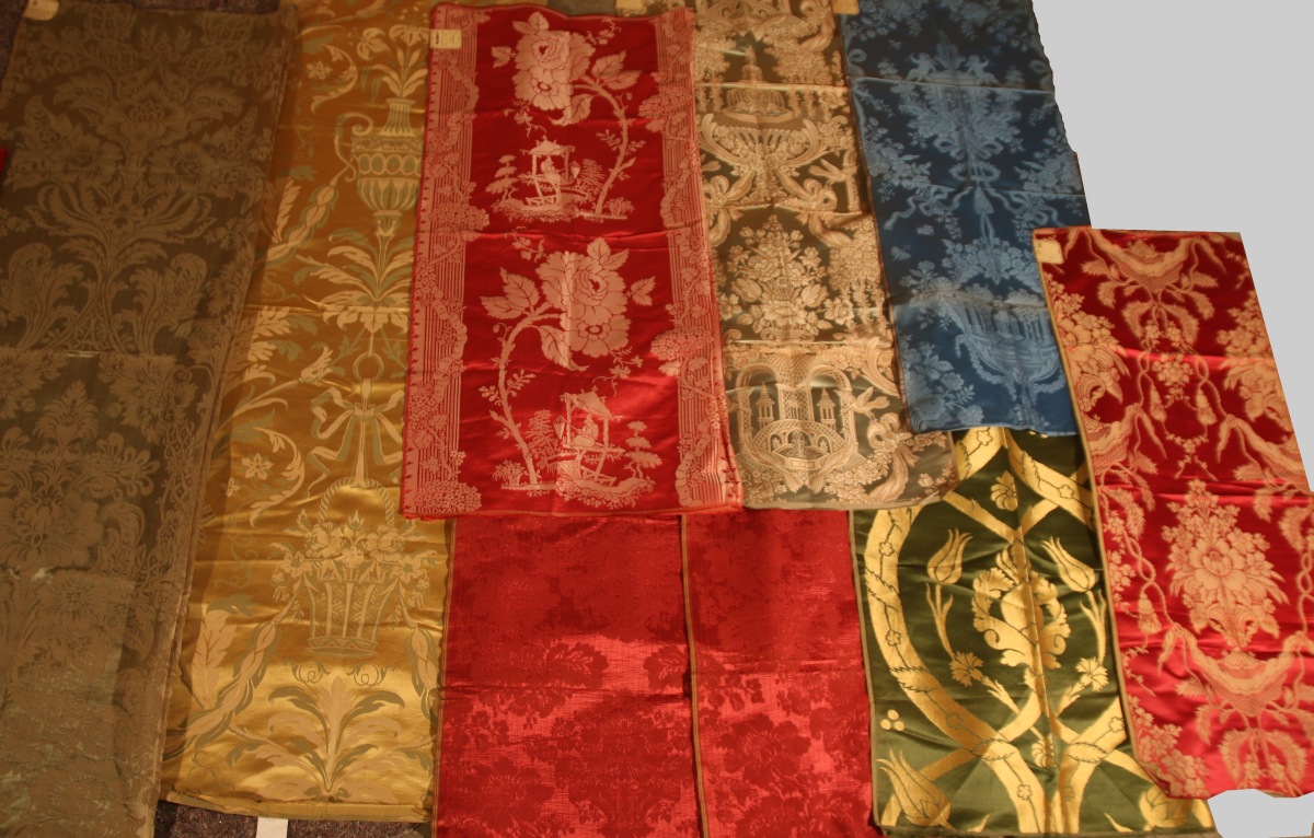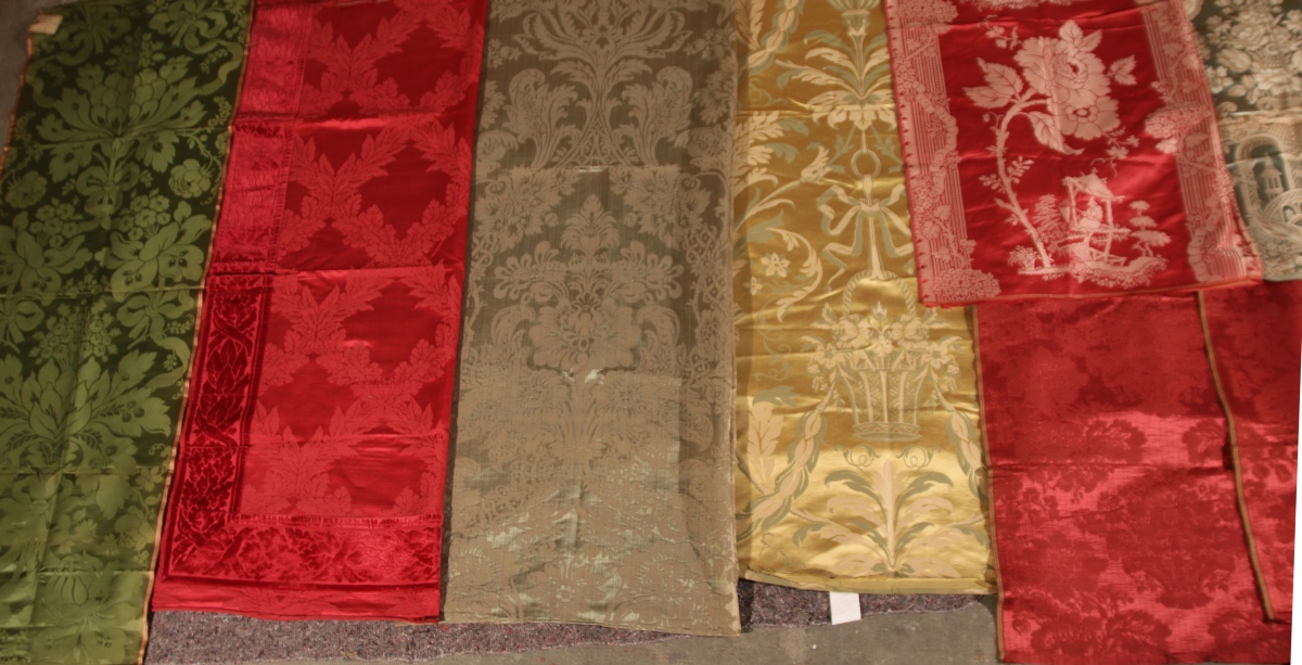 Réunion de lampas, damas, velours, style du XVIIIème siècle et Empire, vert, rouge, jaune, bleu, crème, chinois, fleurs, nuds.