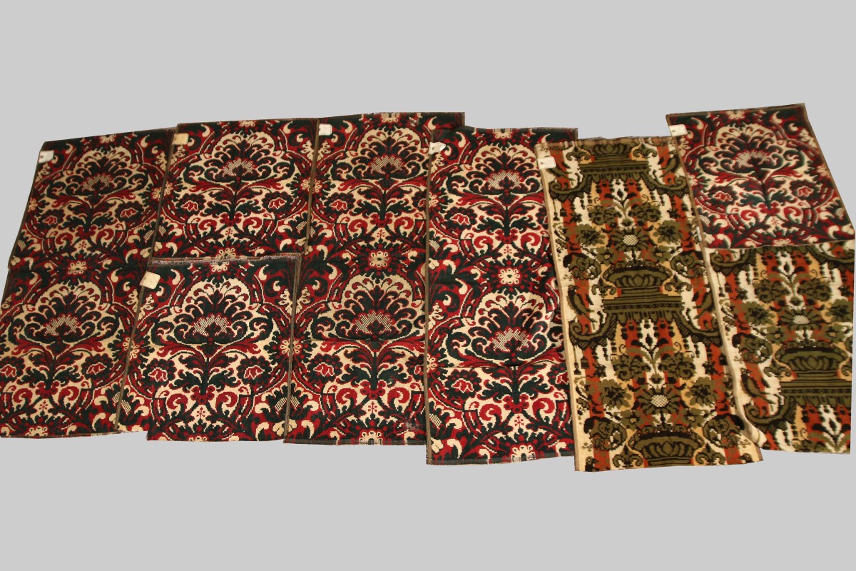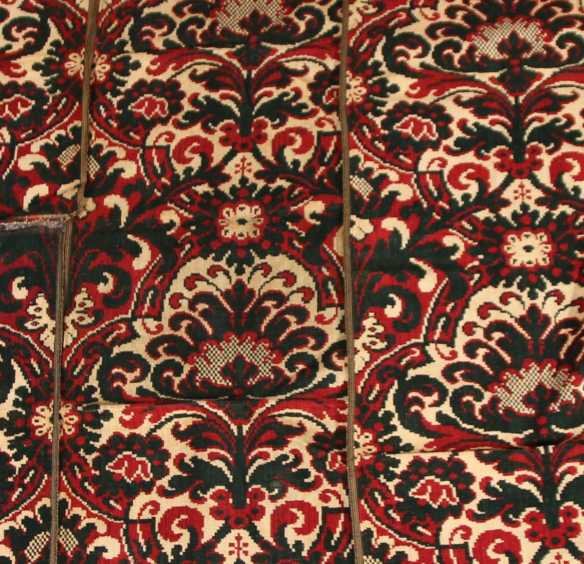 Réunion de velours style Louis XIII, crème, rouge, vert, noir, fleurs, rayures, oiseaux.