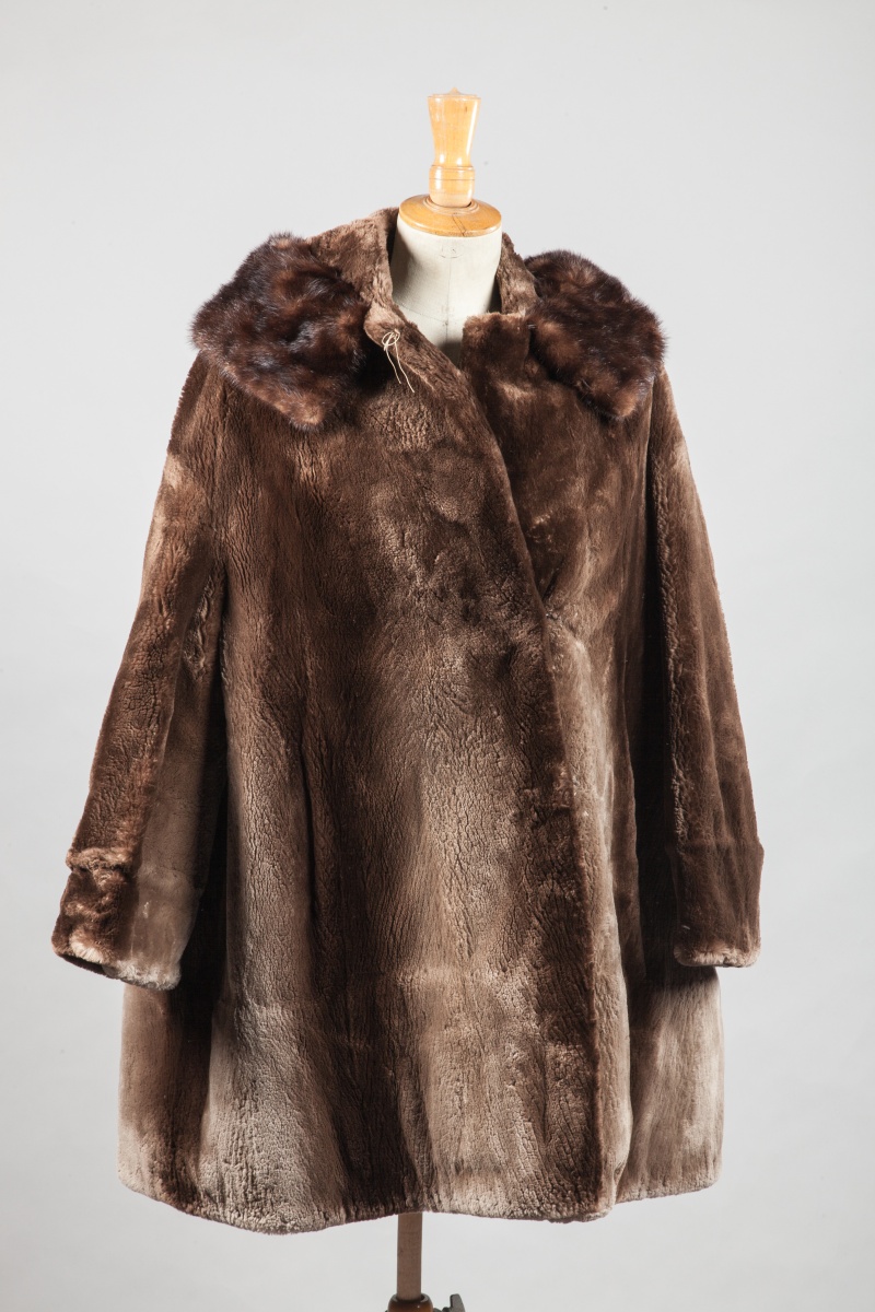 MANTEAU en FOURRURE marron, le col en vison. La doublure en satin beige brodée de motifs floraux argentés.