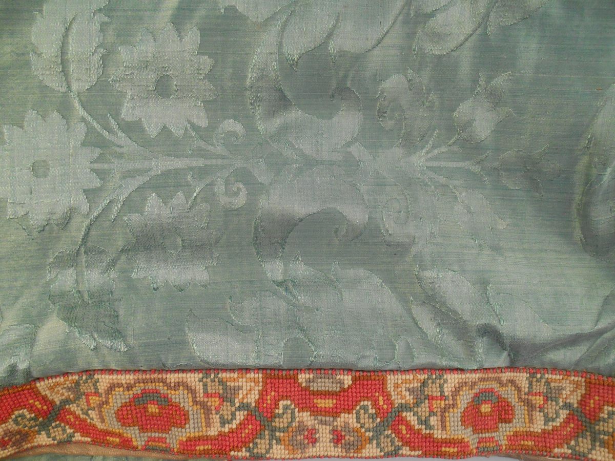 DESSUS de LIT dans un damas Régence, fond satin chiné vert, décor en pointe d'une fleur épanouie dans des ramages, bordure de tapisserie au point.