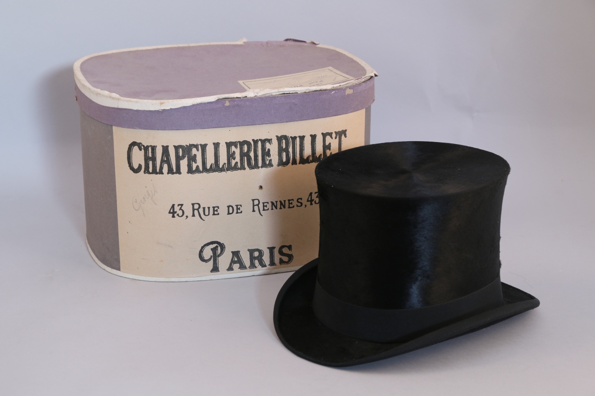 CHAPEAU HAUT-DE-FORME noir, dans sa boîte d'origine.