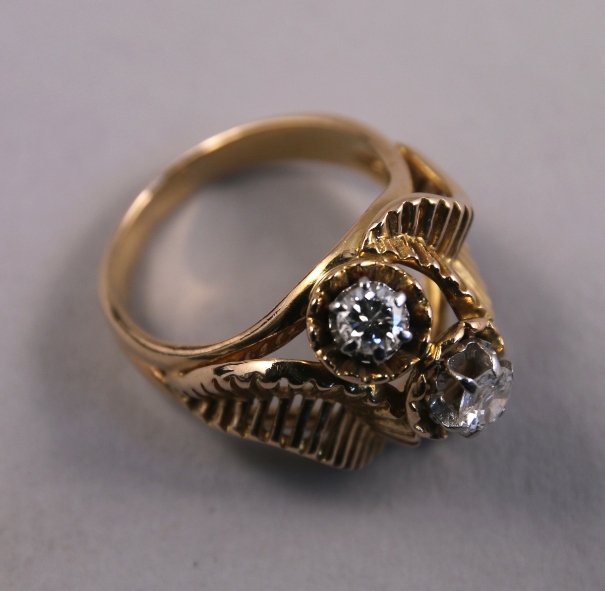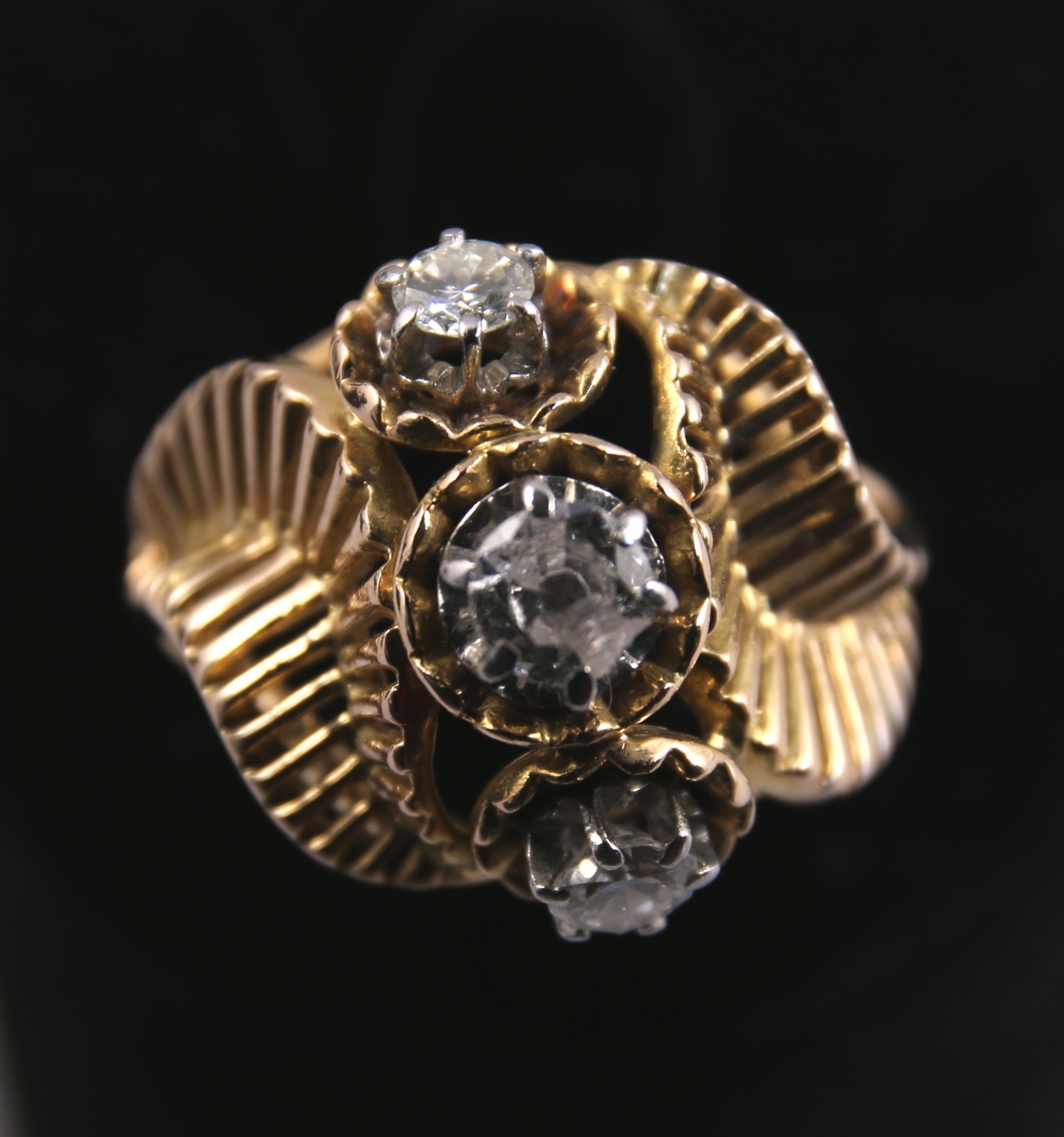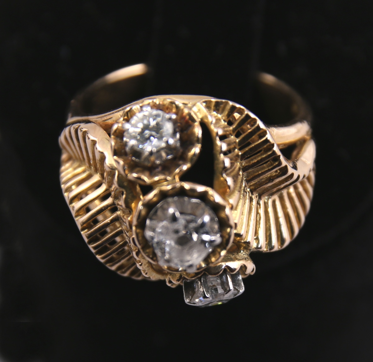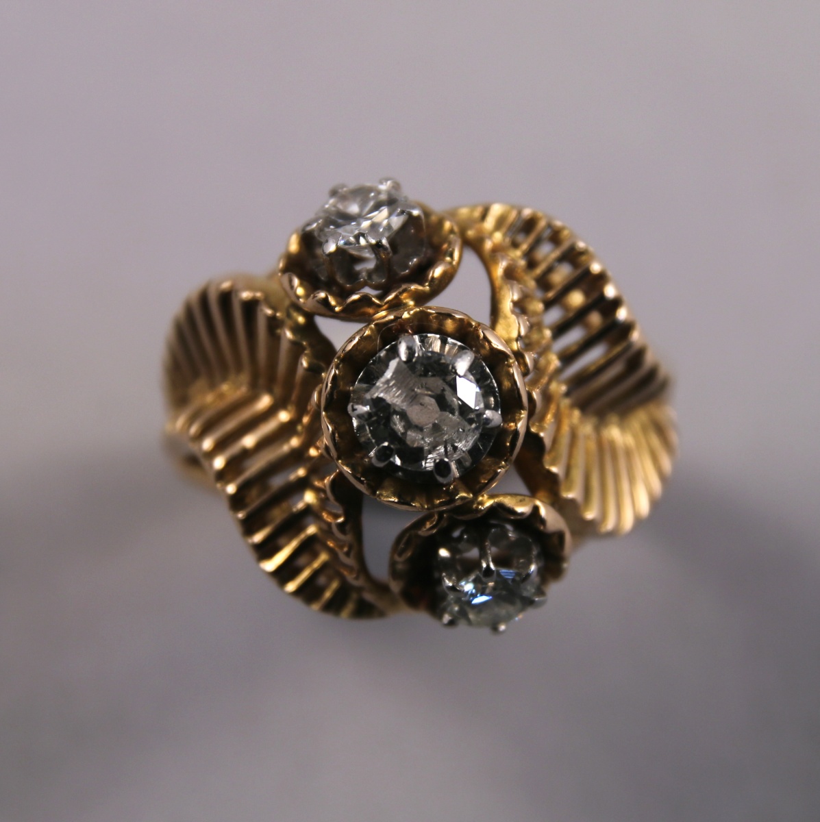 BAGUE en or jaune ornée de trois DIAMANTS montés sur deux feuilles ajourées en cabochon.