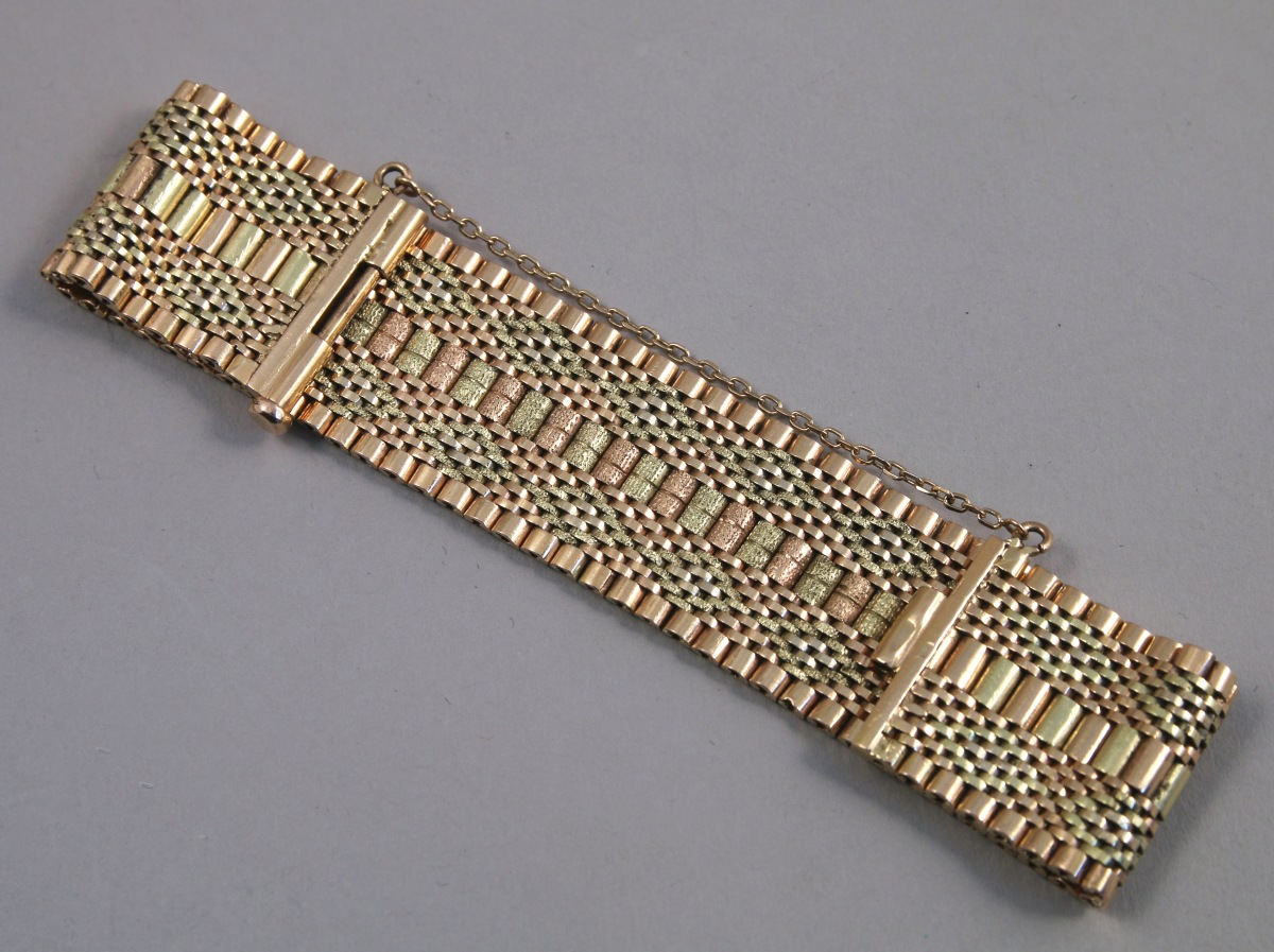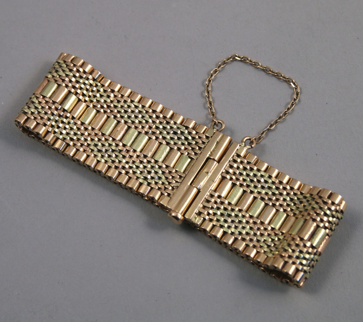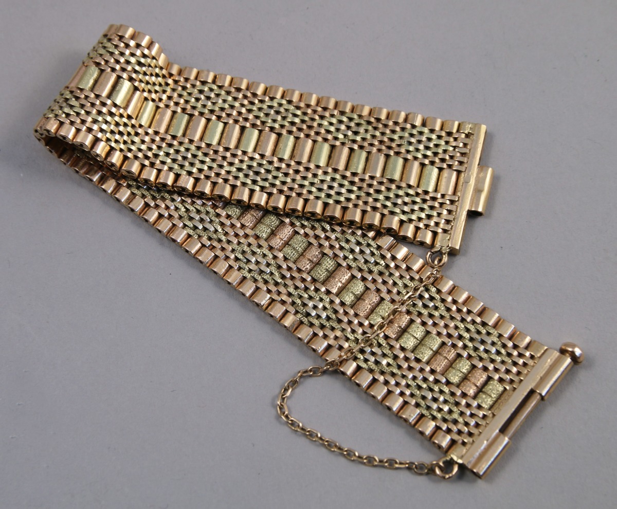BRACELET TANK à larges mailles souples en or jaune et rose. Chaîne de sécurité.