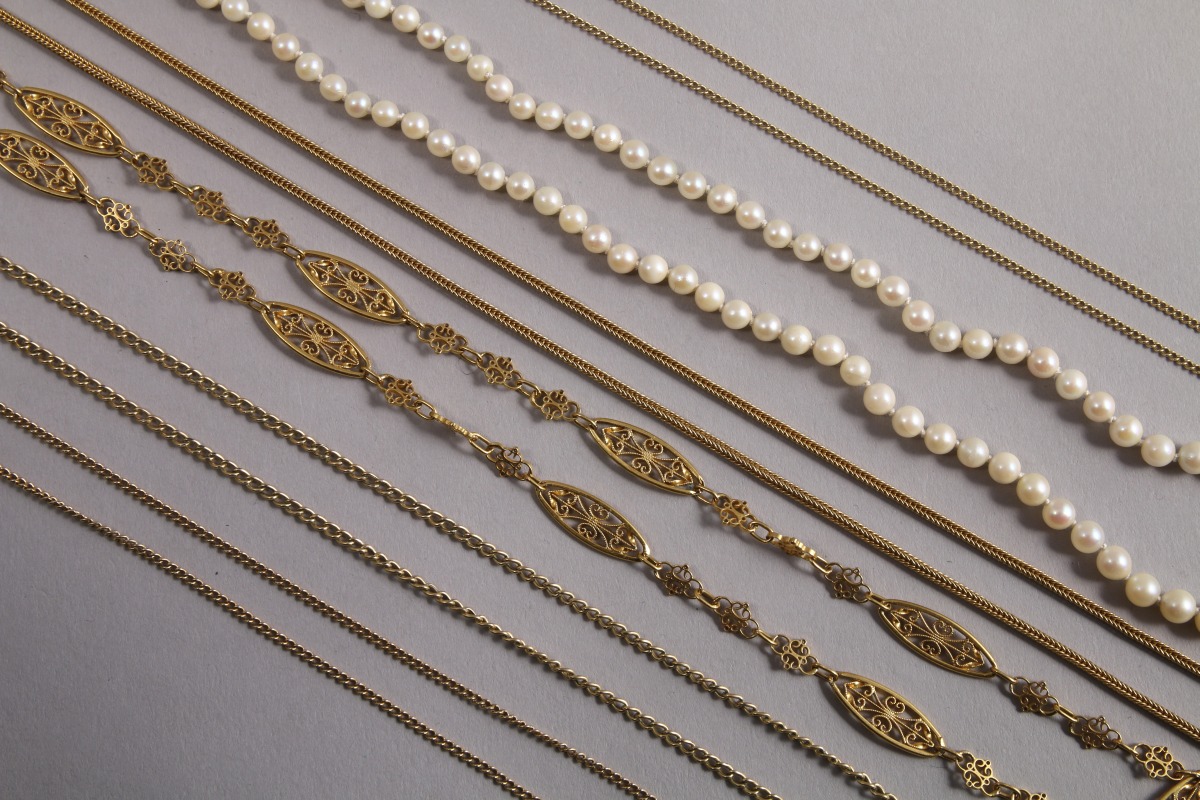5 CHAÎNES en or jaune. Longueurs diverses. Poids 38,5 g. JOINT: COLLIER de PERLES en chute.