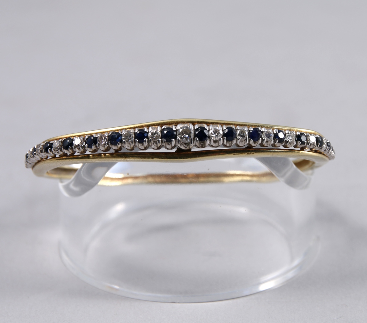 BRACELET rigide en or jaune serti en chute de 17 DIAMANTS en alternance avec 18 SAPHIRS. Griffes en or blanc ou platine. Poinçon Hibou, travail étranger.