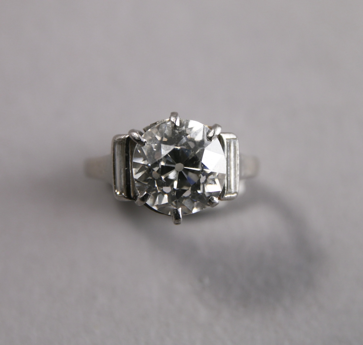 BAGUE en platine 850 millièmes, ornée au centre d'un DIAMANT rond de taille ancienne entre deux diamants baguettes.