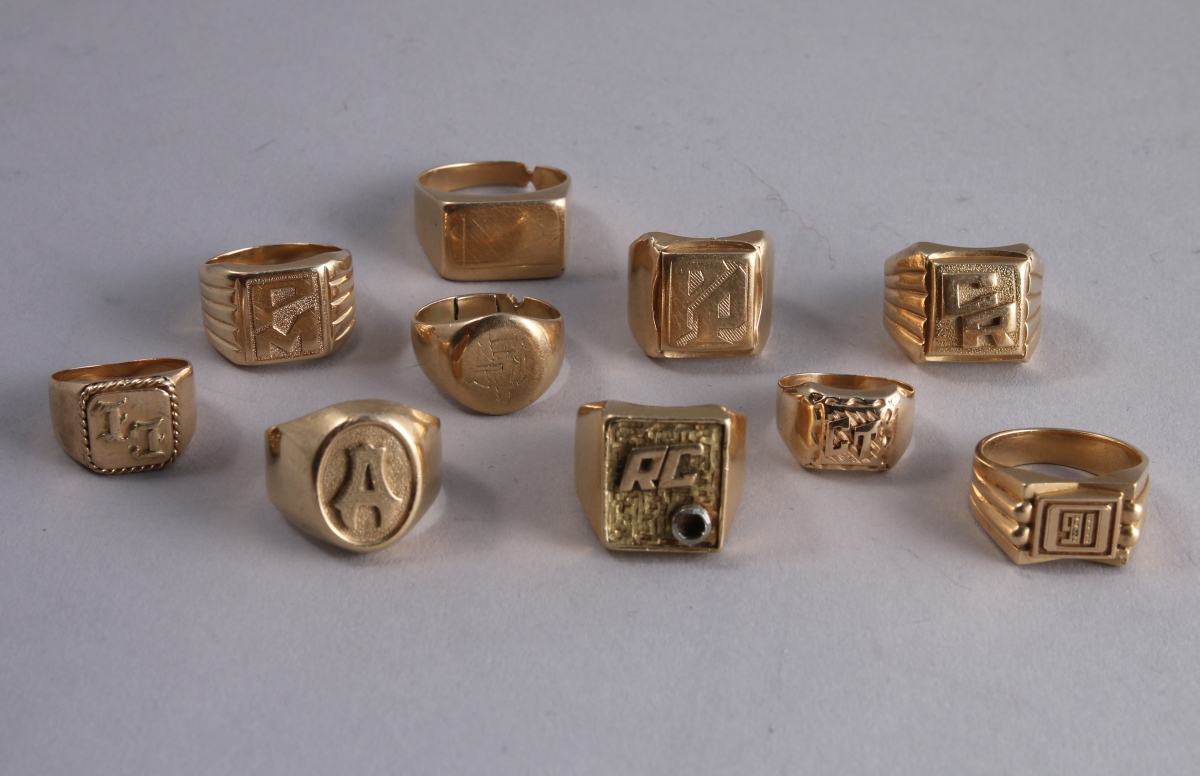 Réunion de 10 BAGUES CHEVALIÈRES en or jaune.