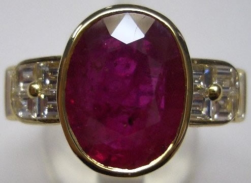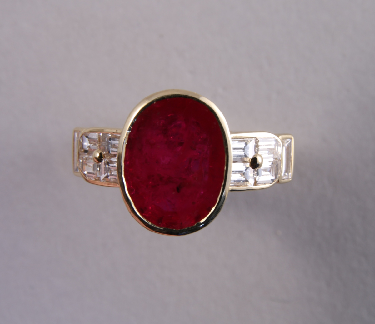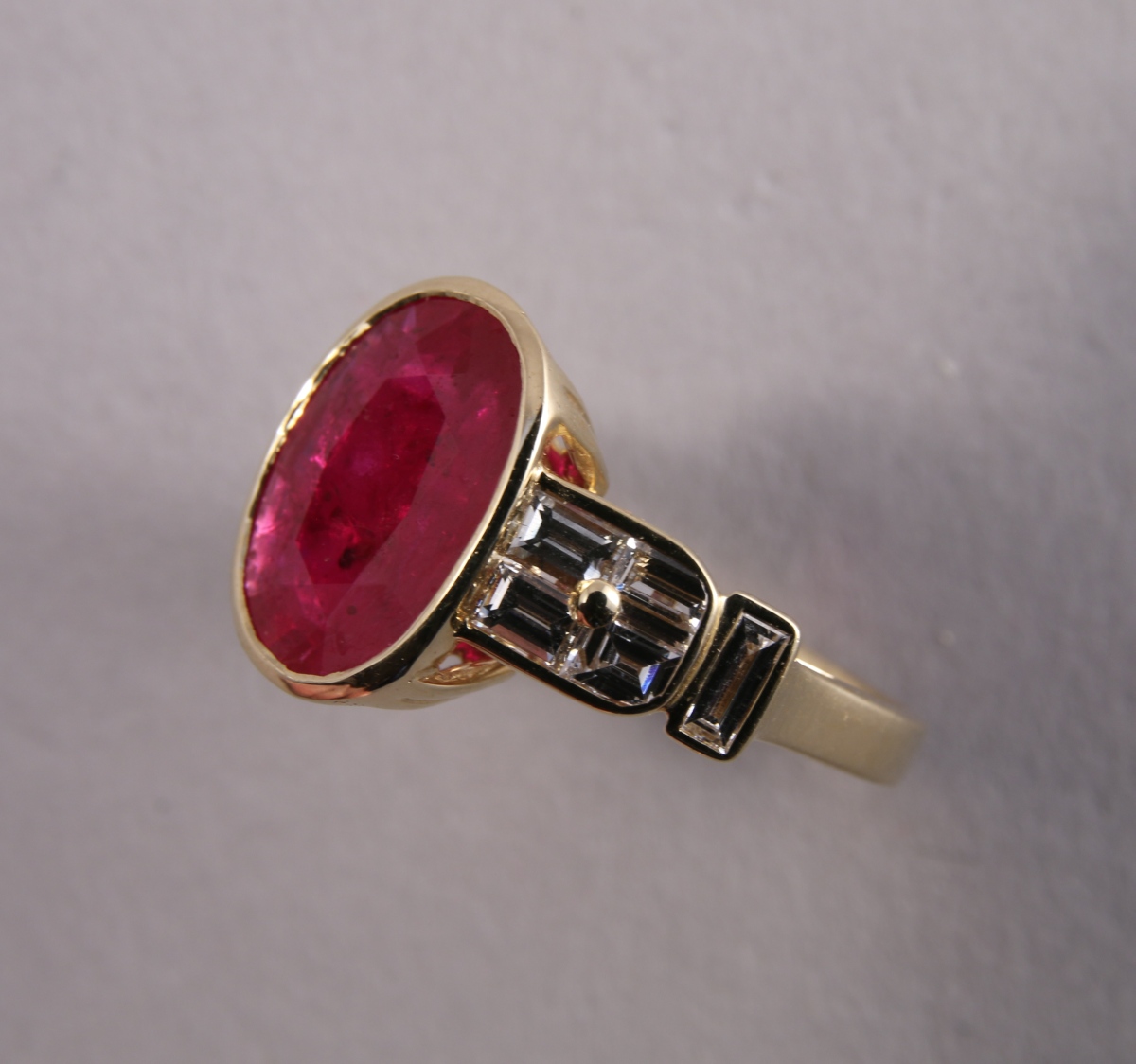BAGUE en or orné d'un RUBIS taille ovale d'environ 4,33 carats, épaulé de 10 DIAMANTS blancs taille baguette d'environ 1,25 carats.