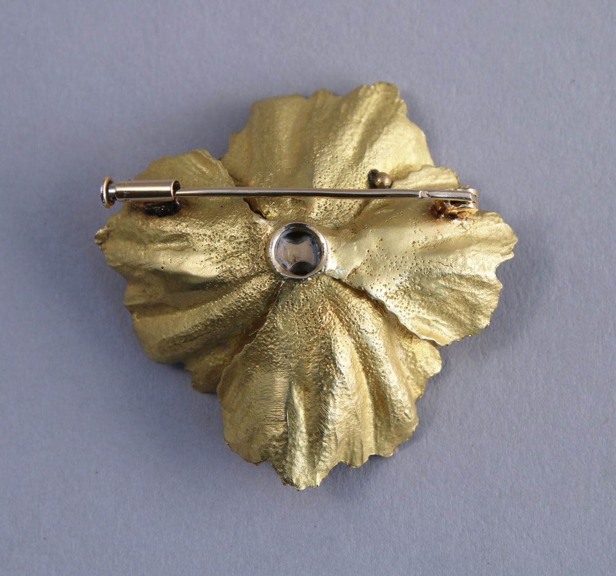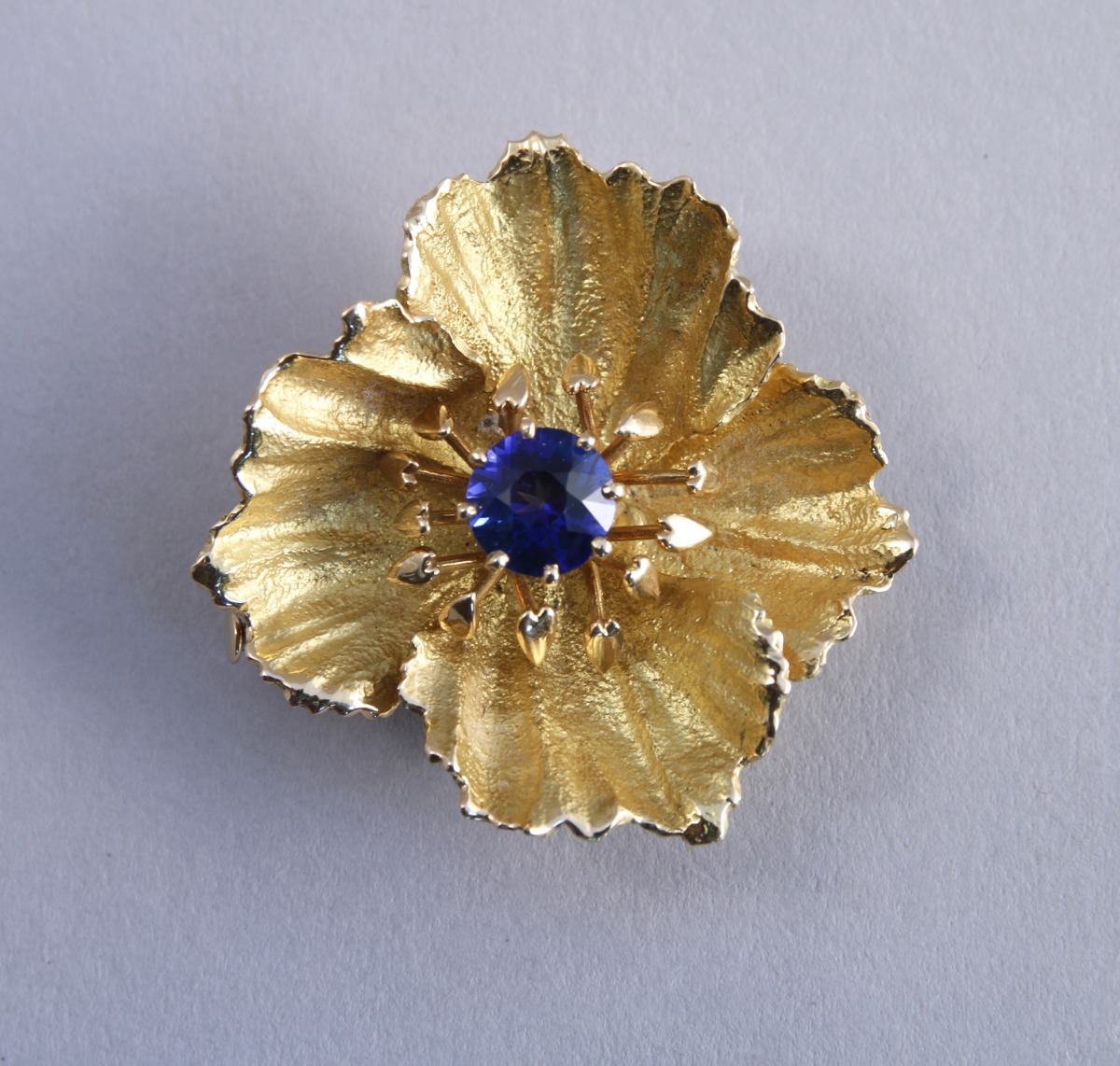 BROCHE FLEUR en or jaune 750 millièmes gravé, le centre orné d'une pierre de synthèse bleue de forme ronde. (Transformations et traces de soudure).