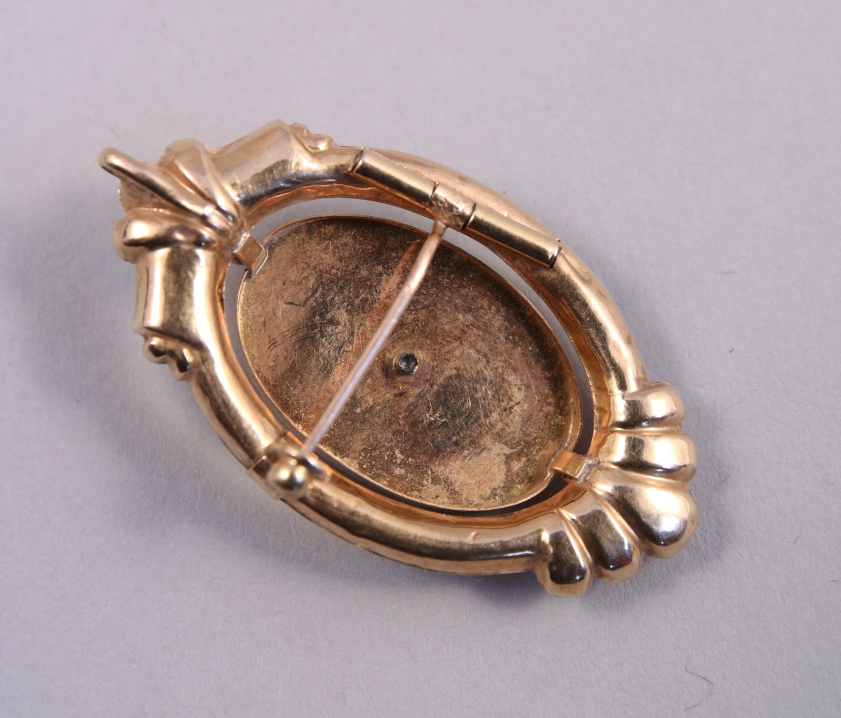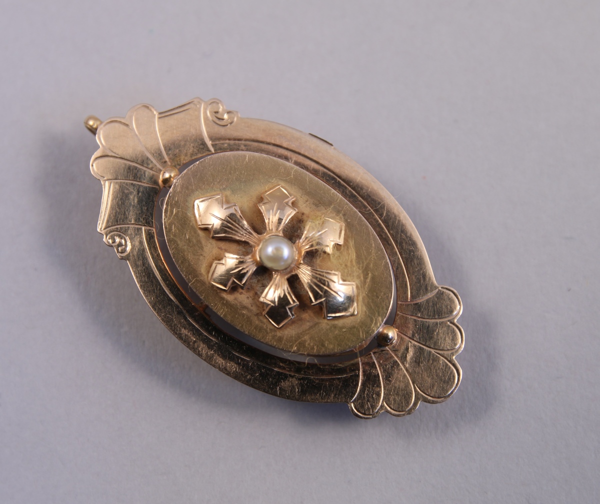 BROCHE de forme oblongue en or, orné d'une PERLE dans une fleur stylisée, dans un encadrement de palmettes ciselées. Travail ancien.