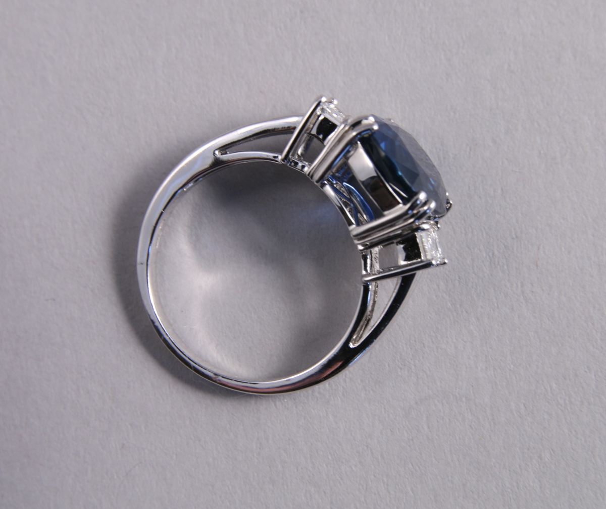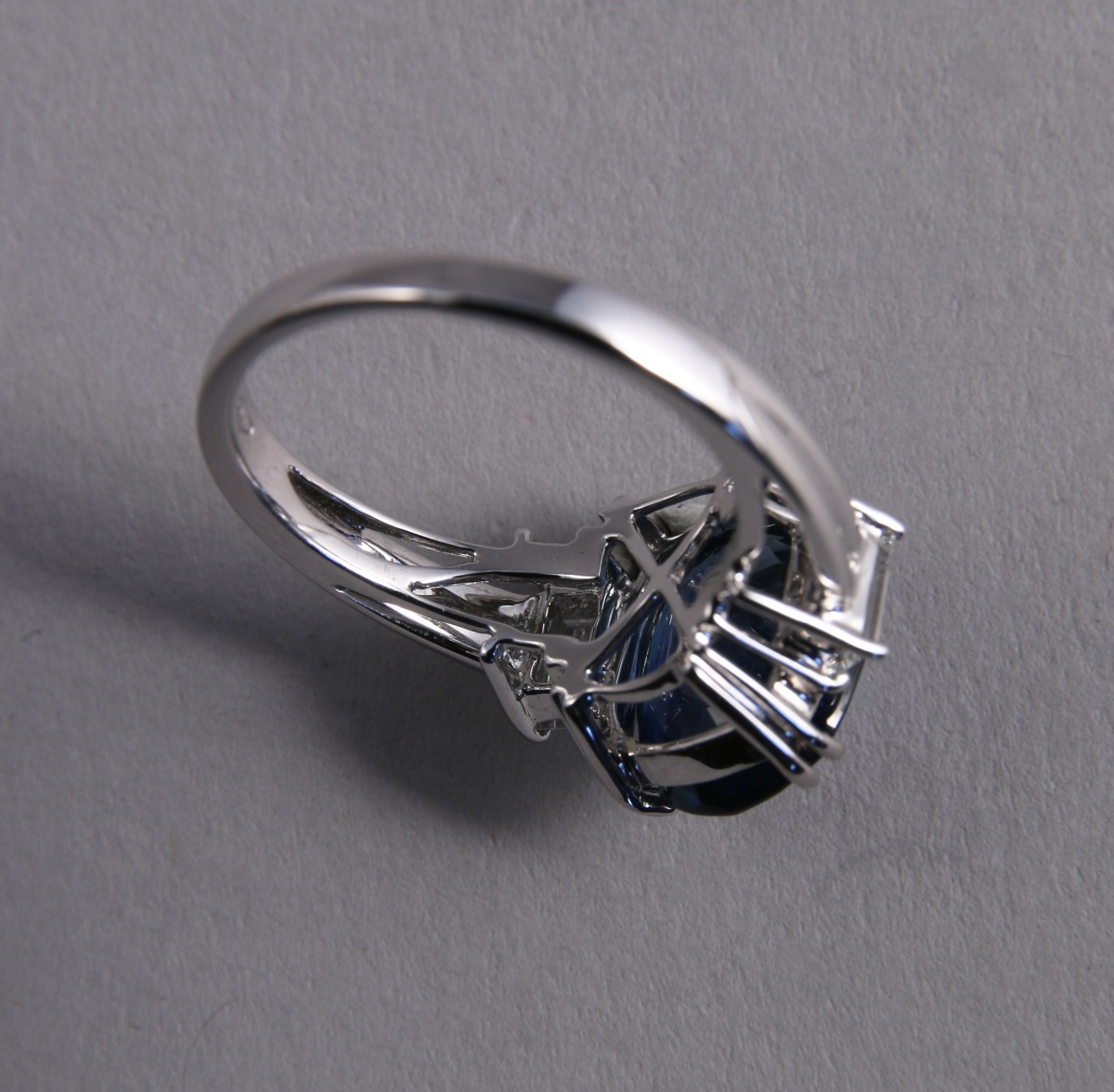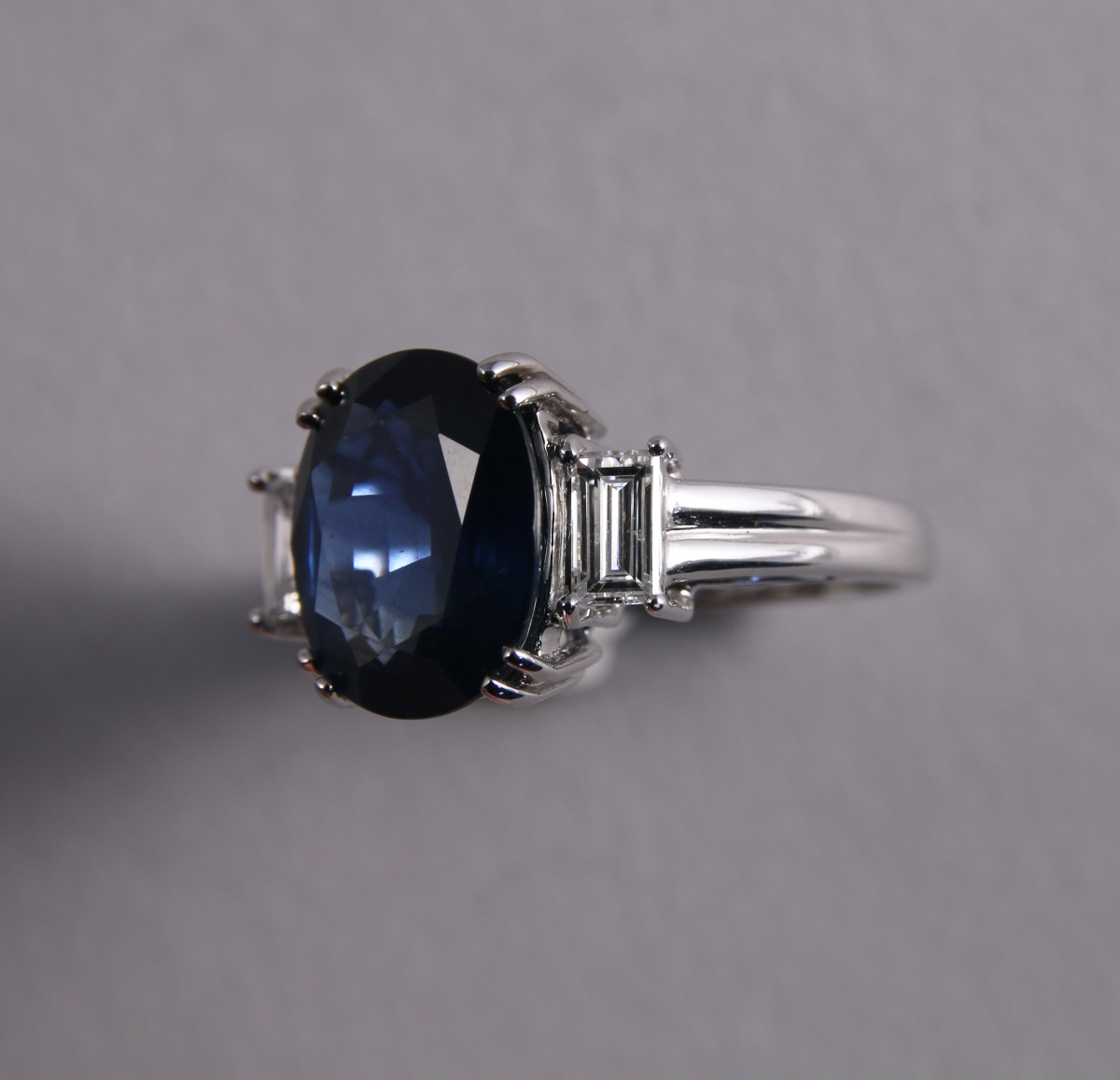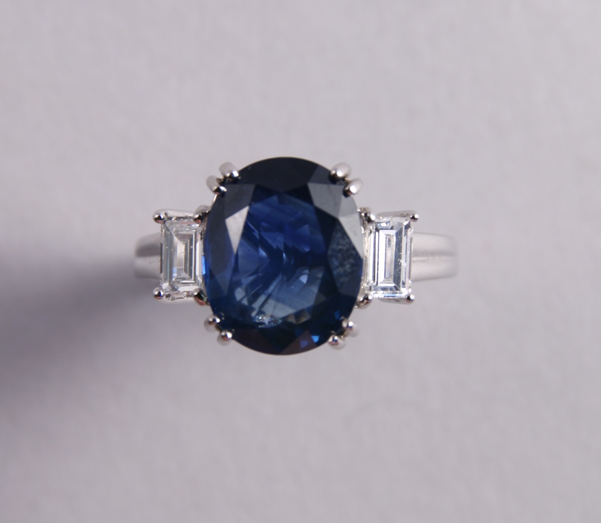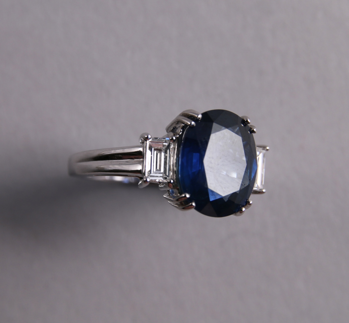 BAGUE en or blanc, ornée d'un SAPHIR taille ovale d'environ 5,45 carats, épaulé de 2 DIAMANTS blancs taille baguette d'environ 0,45 carat.