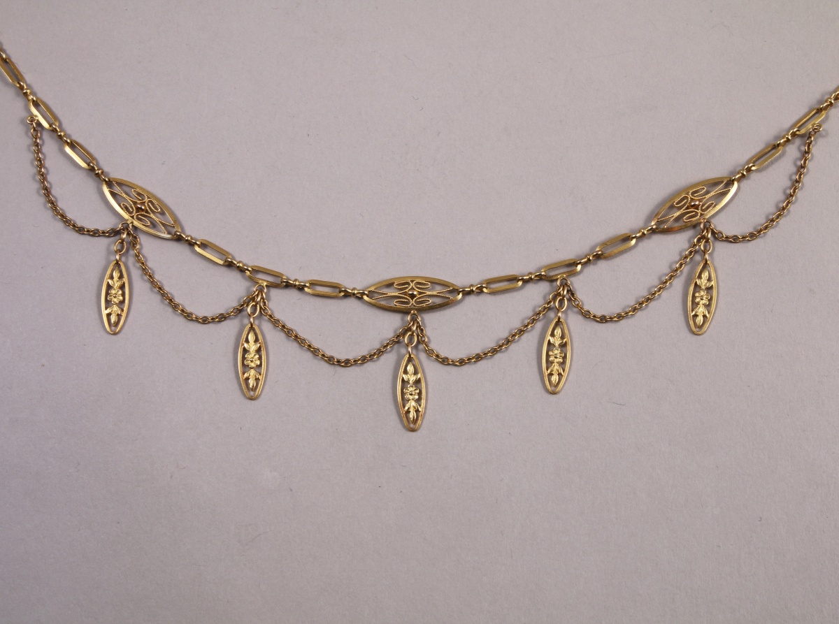 COLLIER DRAPERIE en or jaune orné de motifs ovales filigranés et à décor fleuri.