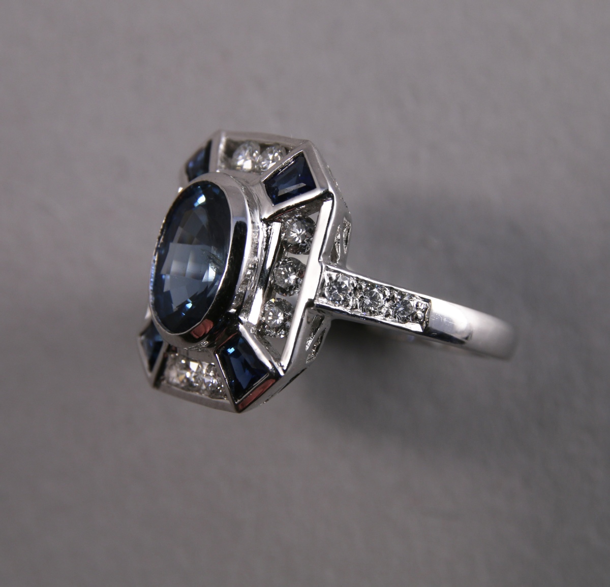 BAGUE rectangle à pans coupés en or blanc, ornée au centre d'un SAPHIR non chauffé taille ovale d'environ 2,25 carats, dans un entourage de 16 DIAMANTS blancs taille moderne d'environ 0,65 carat et, en écoinçons, de 4 SAPHIRS taille trapèze d'environ 0,50 carat .