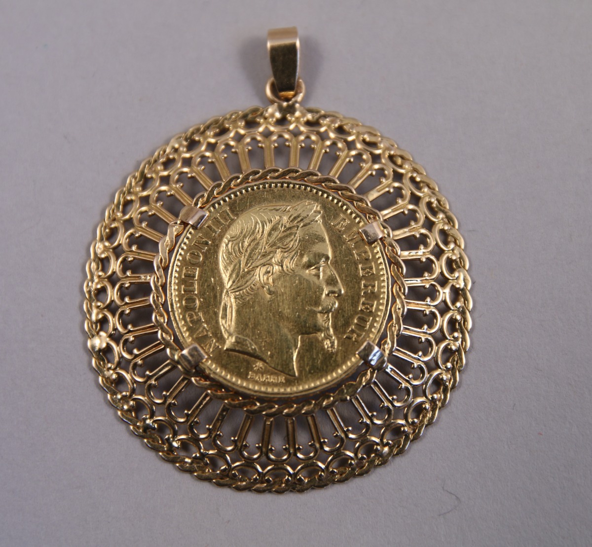 FRANCE. 20 Francs or, Napoléon III lauréé (1867) monté dans un PENDENTIF de forme circulaire ajouré.