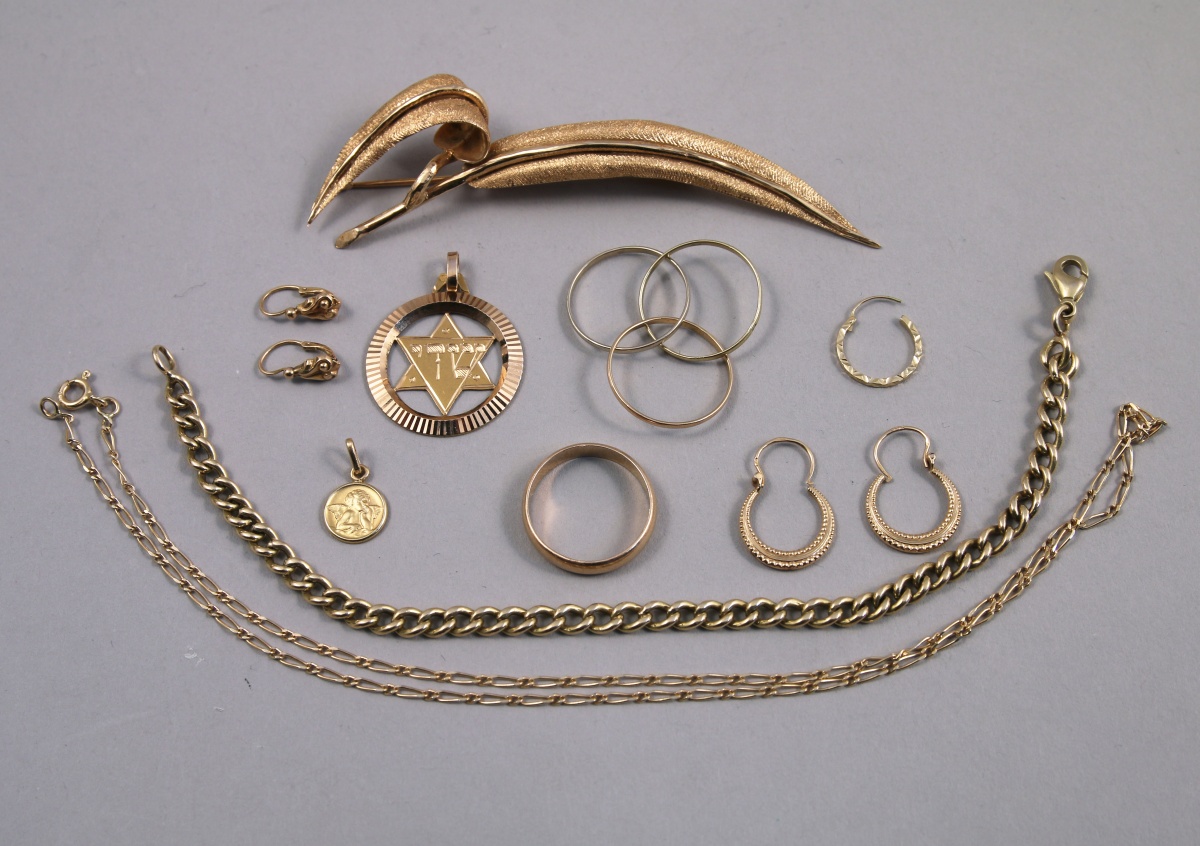Réunion de BIJOUX en or: BROCHE, BAGUE trois or, ALLIANCE, CHAÎNE, BRACELET, 2 PENDENTIFS, BOUCLES d'OREILLES.