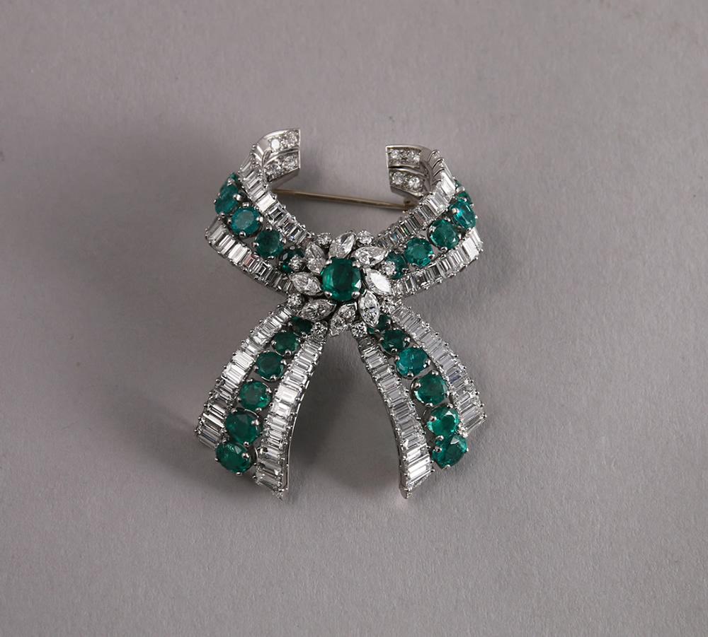 BROCHE-NOEUD en or gris 750 millièmes et platine 850 millièmes entièrement sertie de lignes de DIAMANTS rectangulaires et ÉMERAUDES en chute, celle du centre plus importante dans un entourage de diamants ronds et navette.