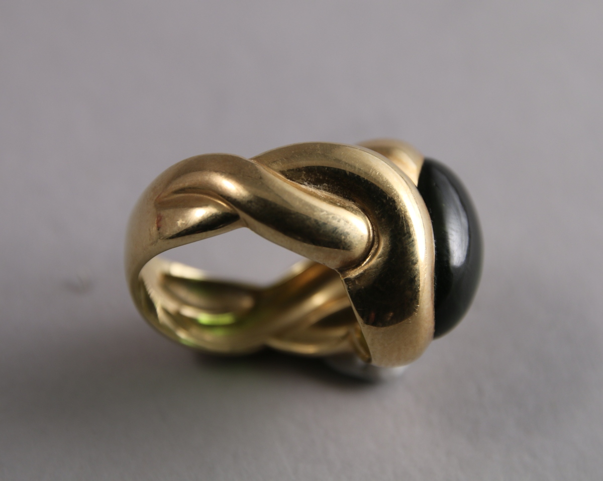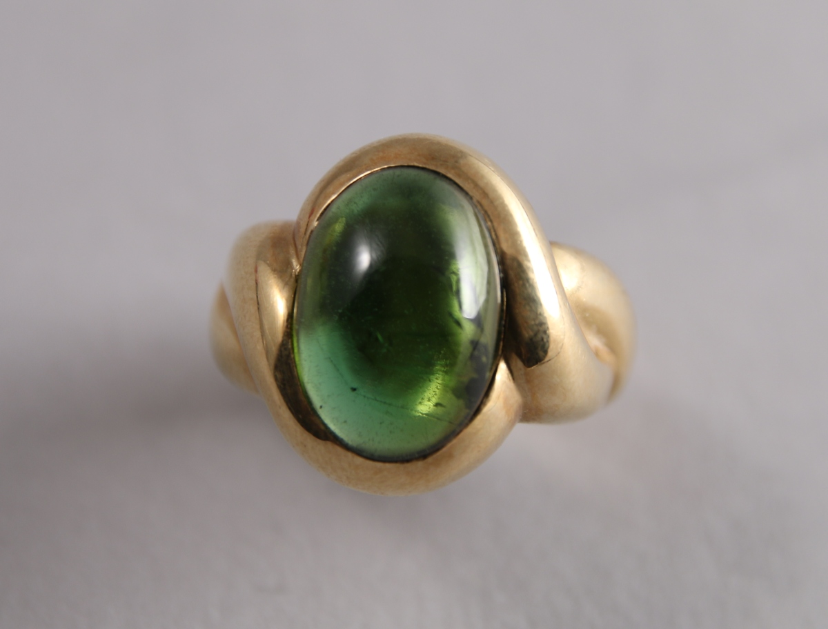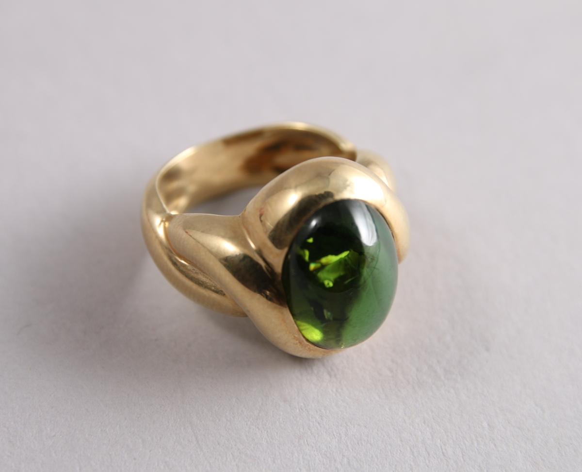 BAGUE en or jaune godronné ornée d'une importante PIERRE VERTE en cabochon.