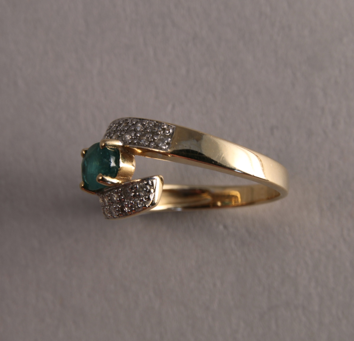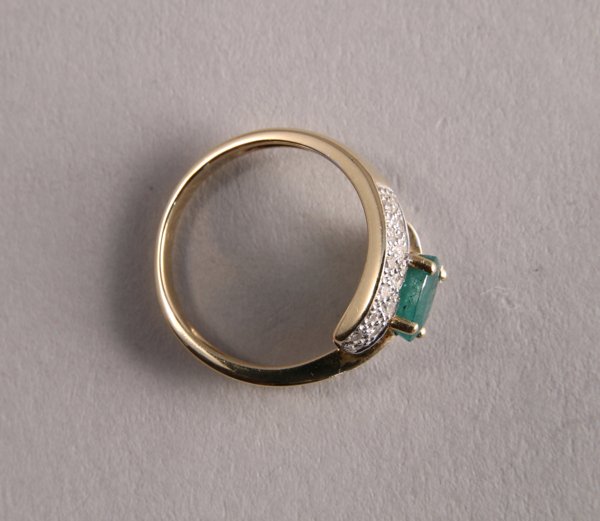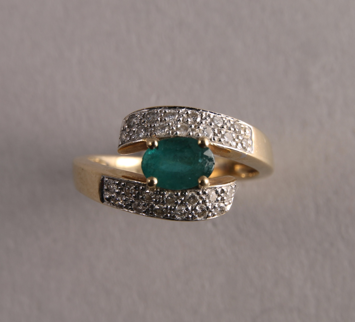 BAGUE sertie d'une ÉMERAUDE taille ovale flanquée de deux pavages de brillants.