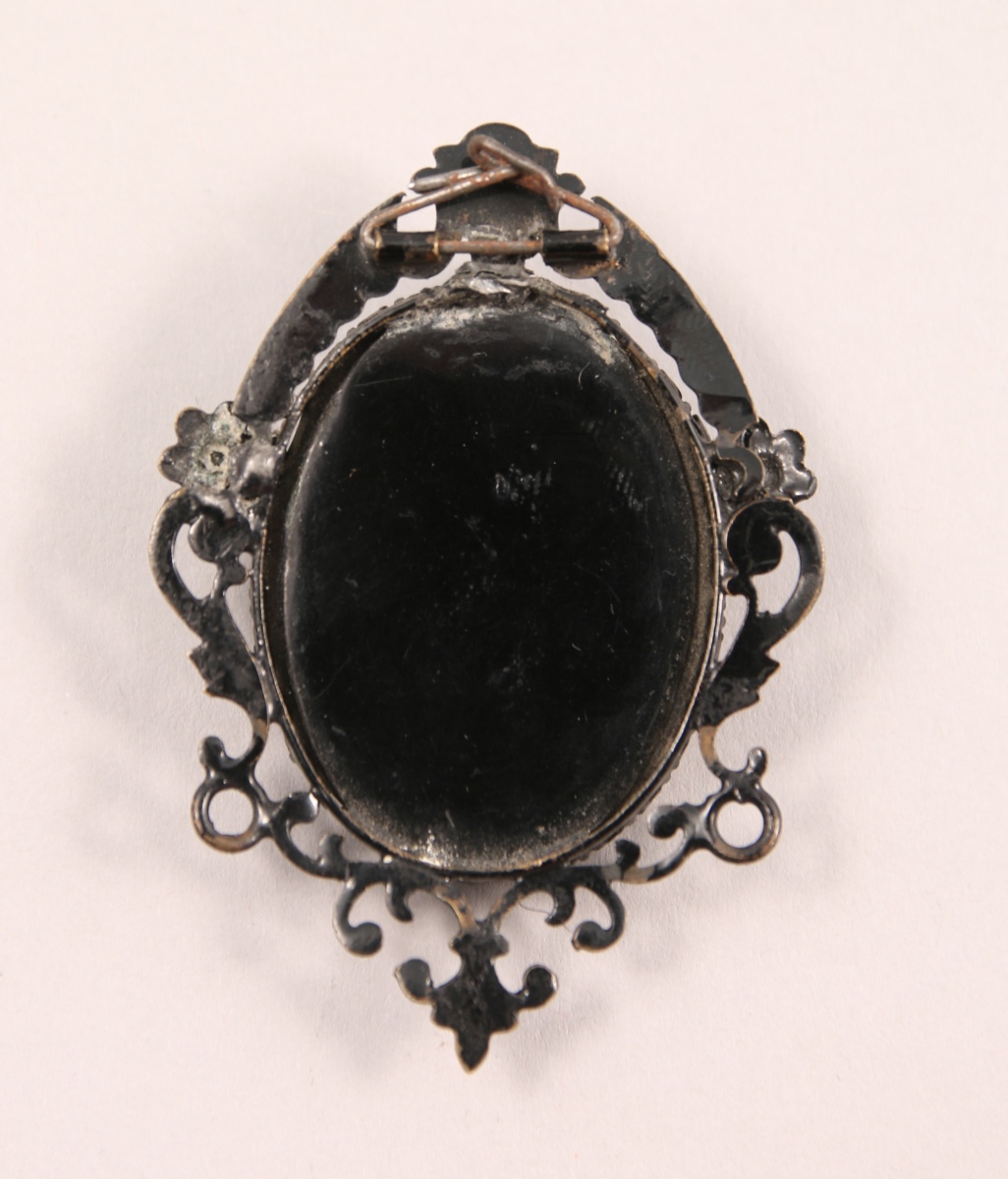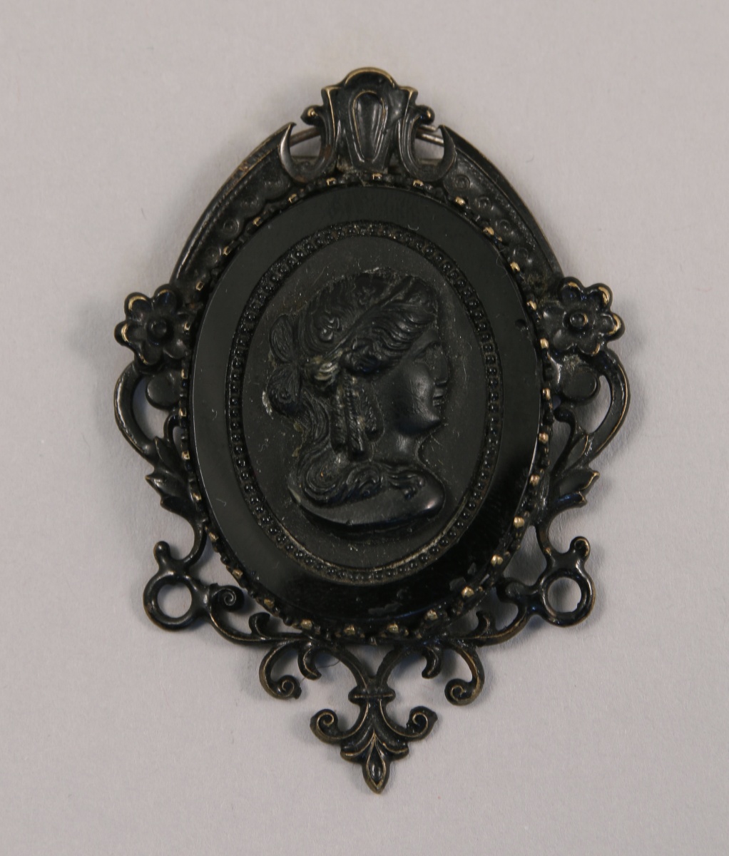 CAMÉE en verre noir figurant une femme de profil. Encadrement en laiton noirci ajouré de rinceaux.