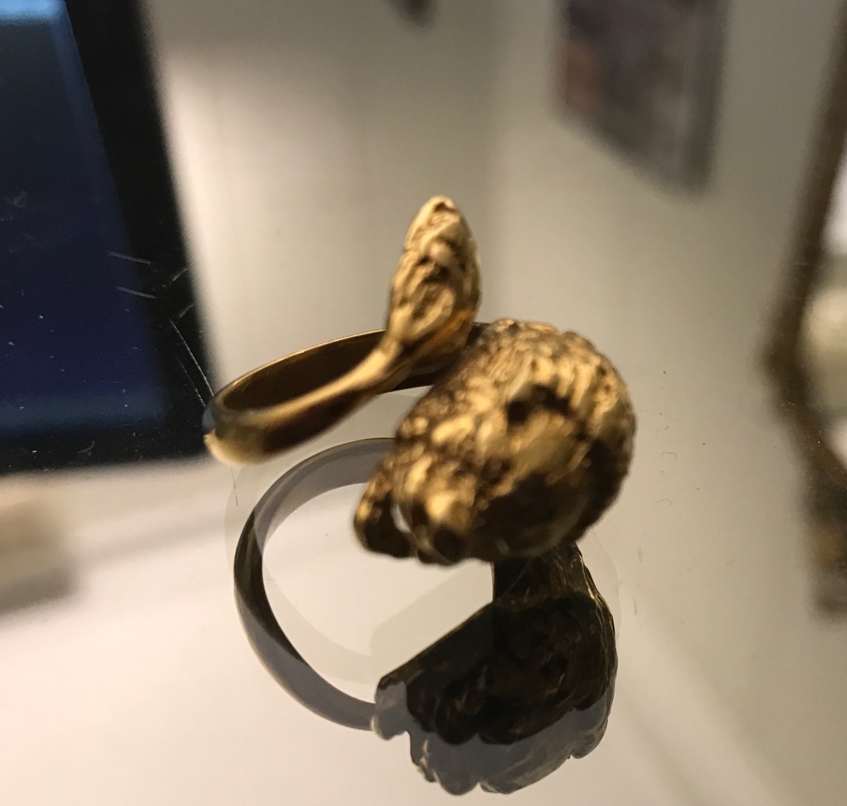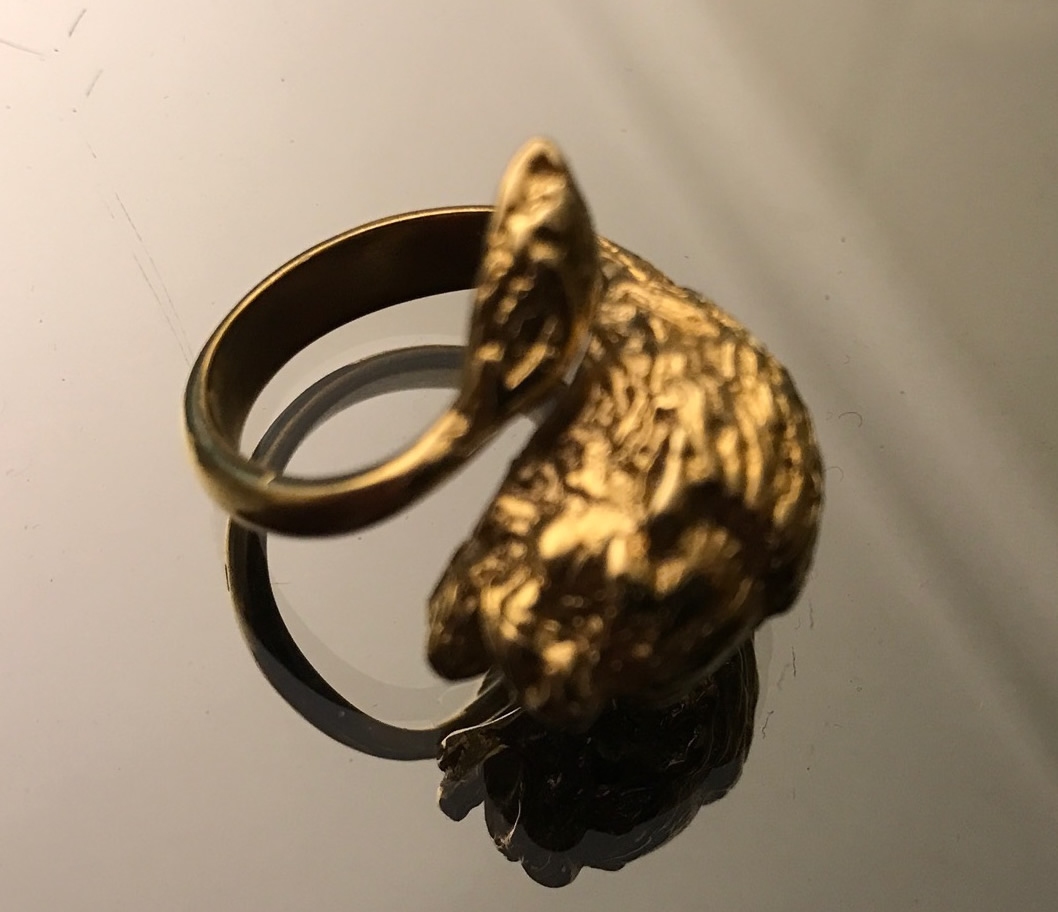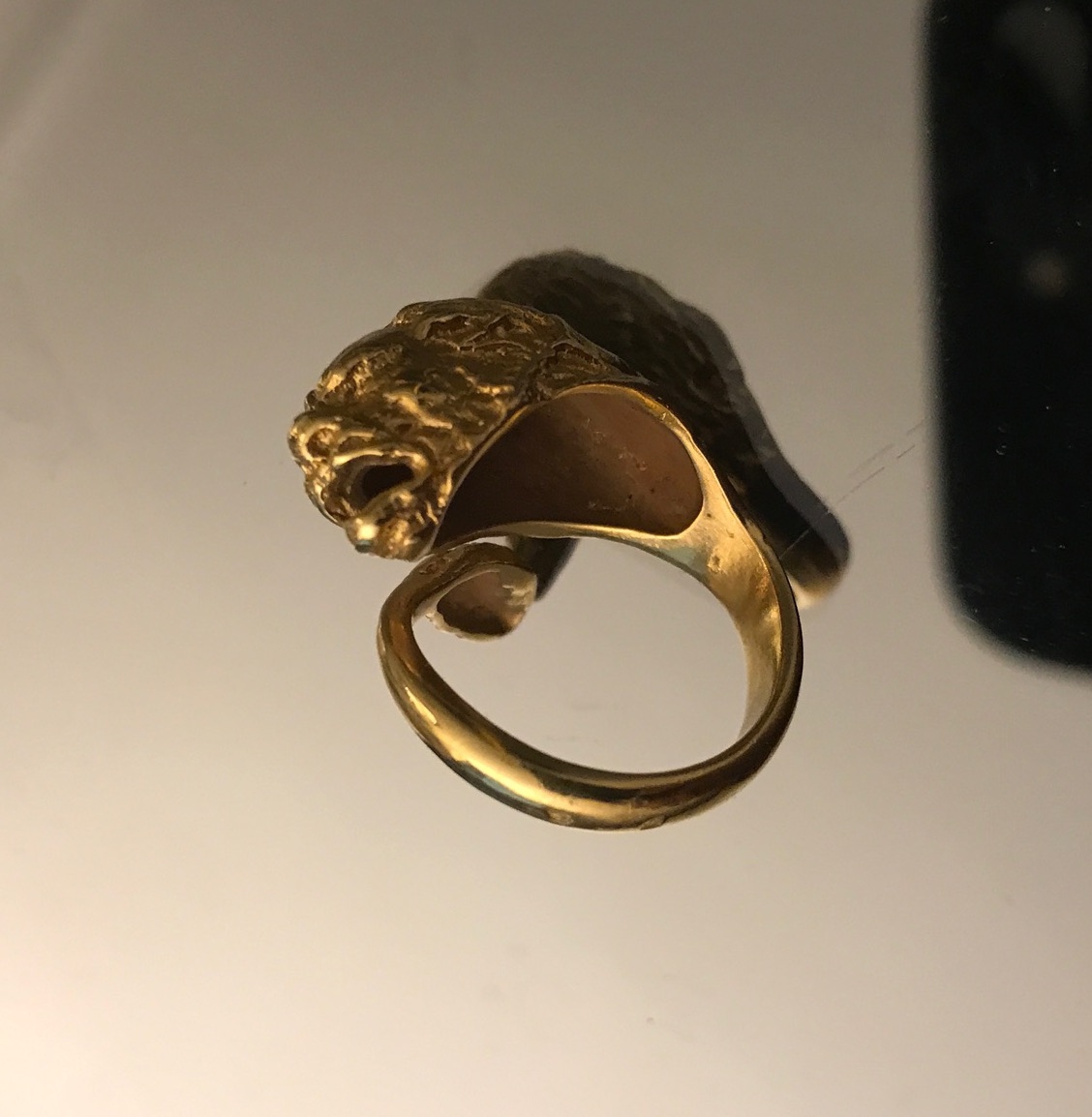 Rare BAGUE en or jaune ornée d'une TÊTE de LION RUGISSANT.