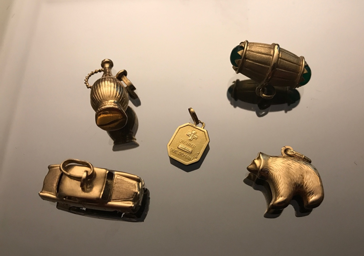 5 BRELOQUES en or jaune 18K: une voiture, un ours, une médaille "+qu'hier et - que demain", une bouteille ornée d'une pierre rouge, une double choppe ornée de deux pierres vertes.