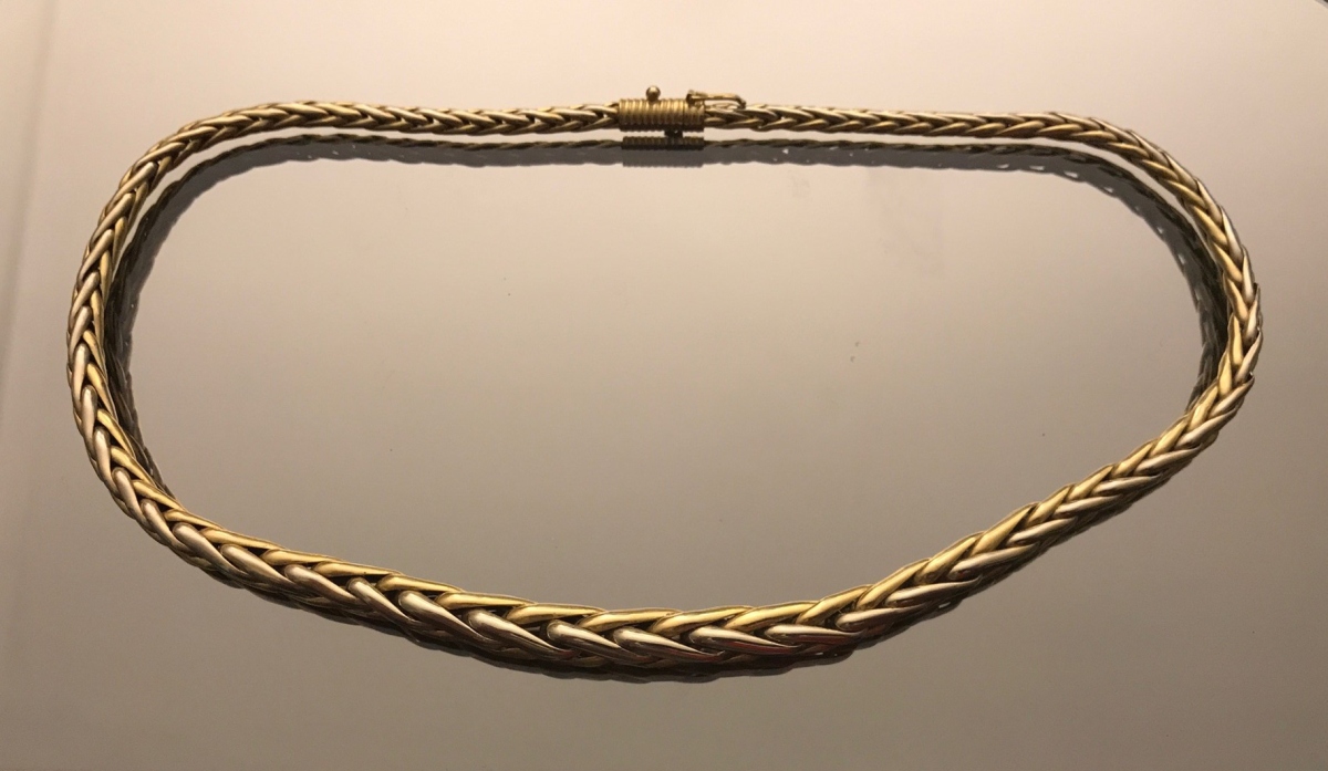 COLLIER en chute en or jaune et blanc tressé.