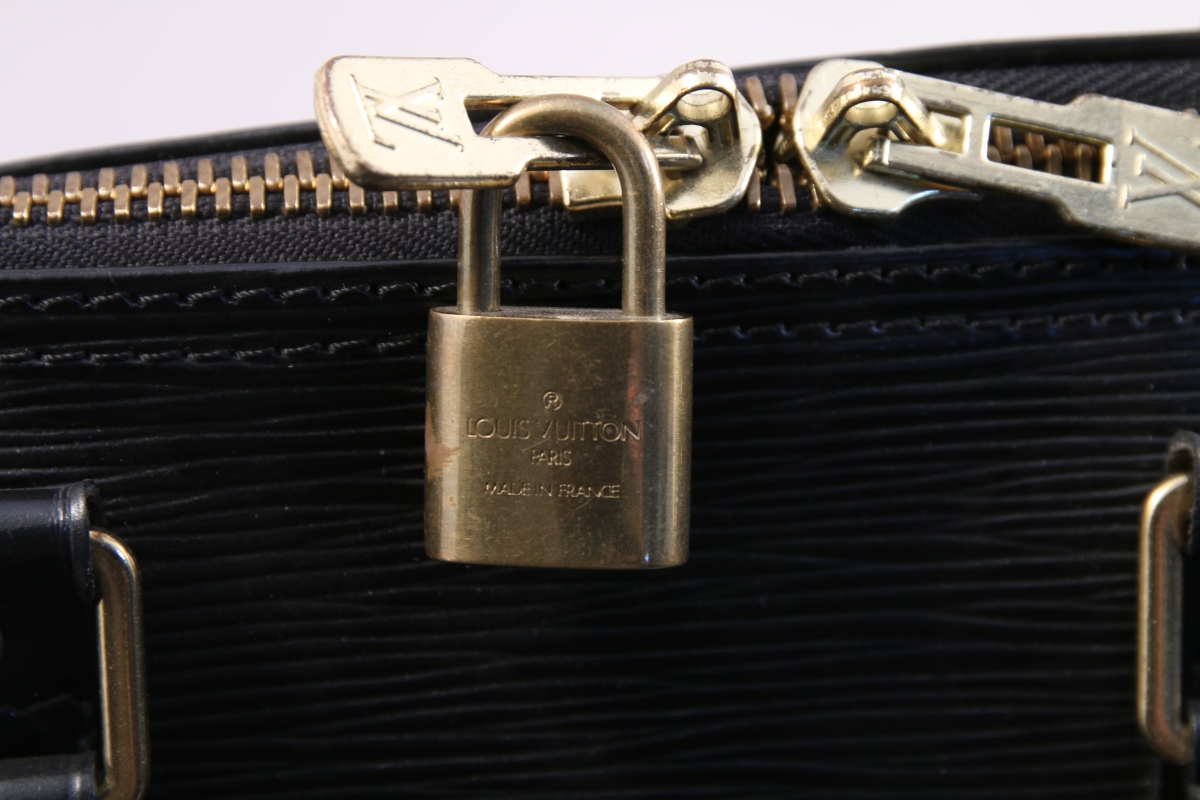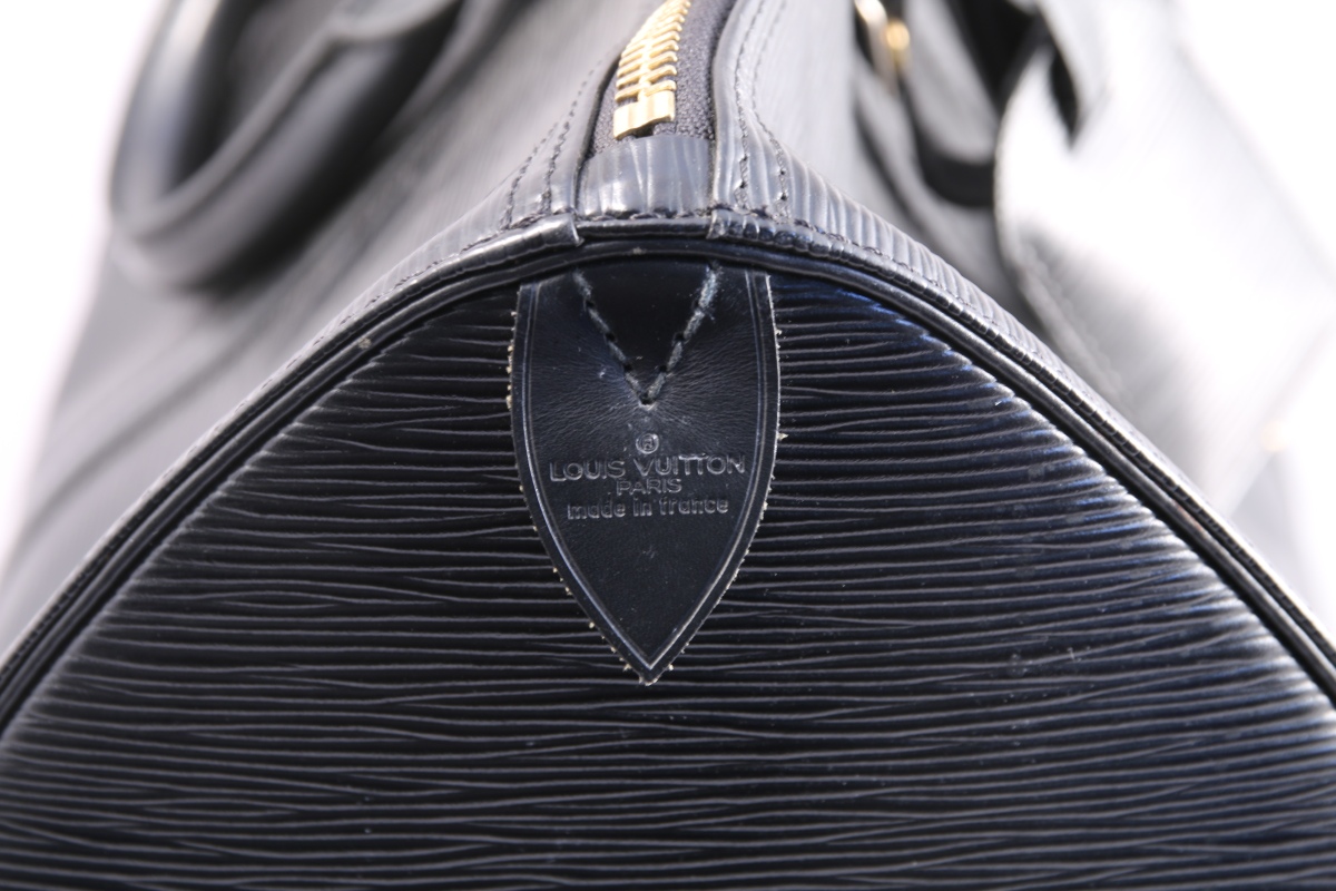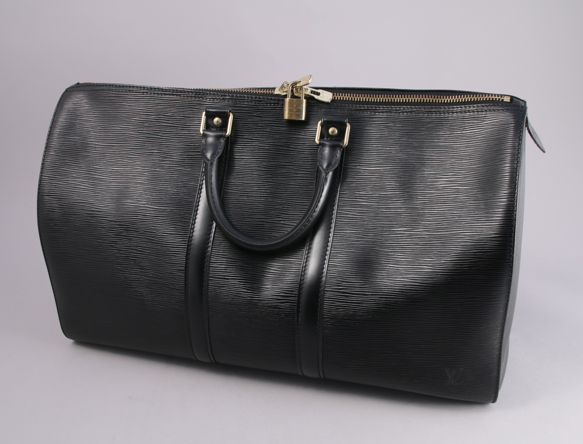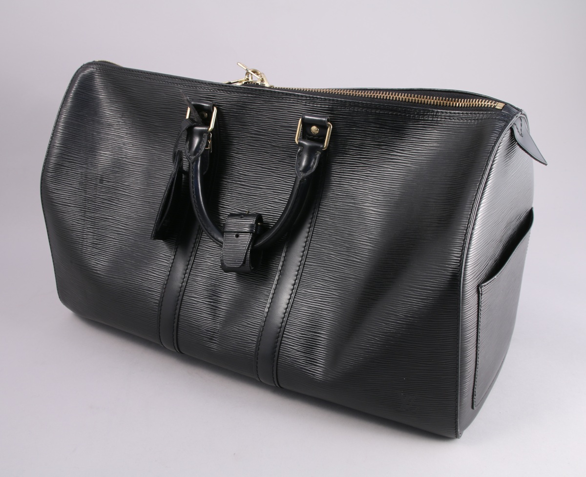 Louis VUITTON. SAC de voyage KEEPALL en cuir épi noir, avec fermeture éclair et une poche extérieure.
