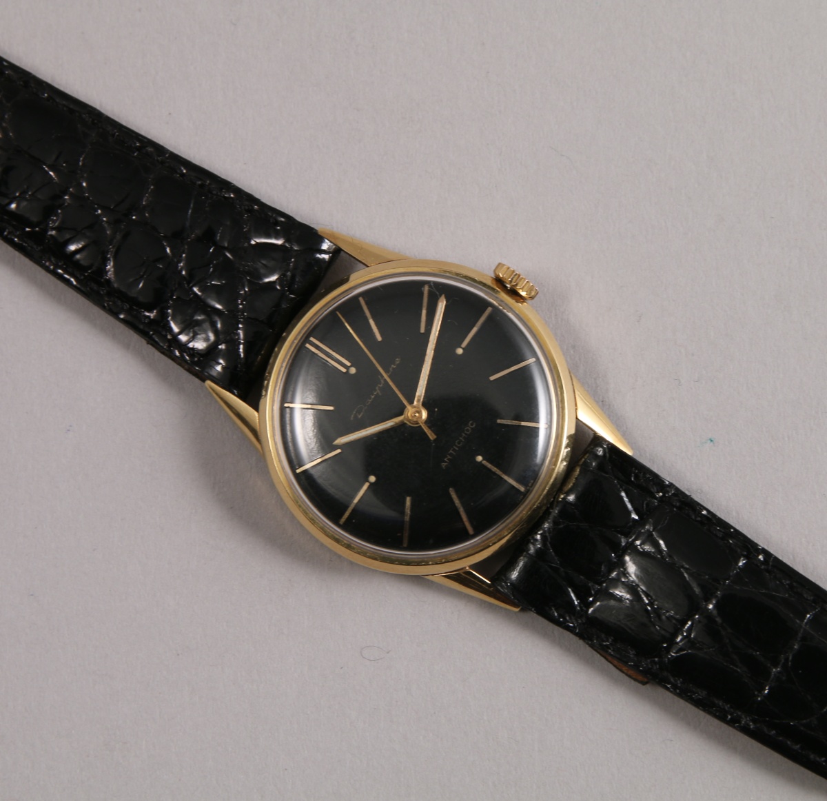 LIP-DAUPHINE (antichoc). MONTRE BRACELET de dame en or. Le cadran noir, le boitier de forme ronde, légèrement bombé, numéroté "1810". Mouvement mécanique. Le bracelet en cuir noir.