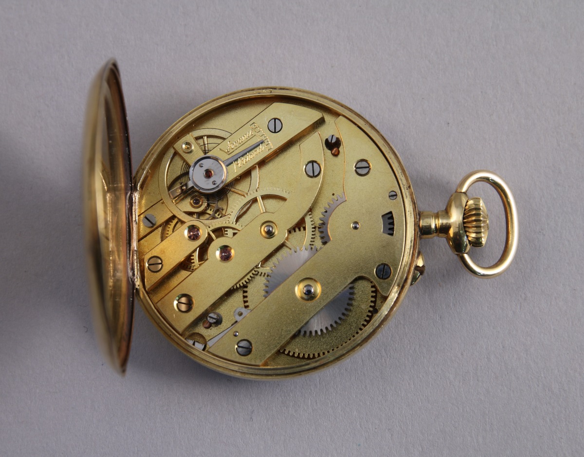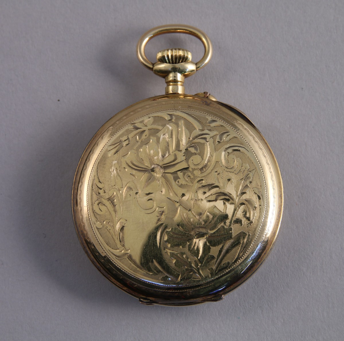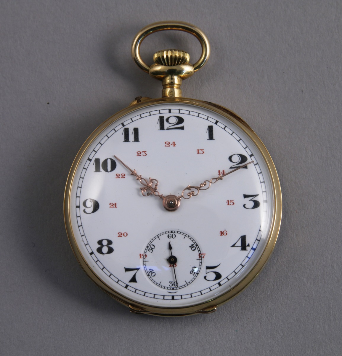 MONTRE de GOUSSET en or, à remontoir au pendant. Double cadran émaillé blanc indique les heures et les secondes en chiffres arabes, la trotteuse à six heures. Le boitier à décor de fleurs au naturel, numéroté "328300", poinçon de maître. Le cache poussière en cuivre. Echappement à cylindre.