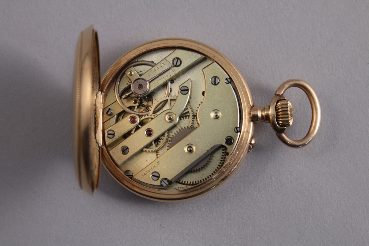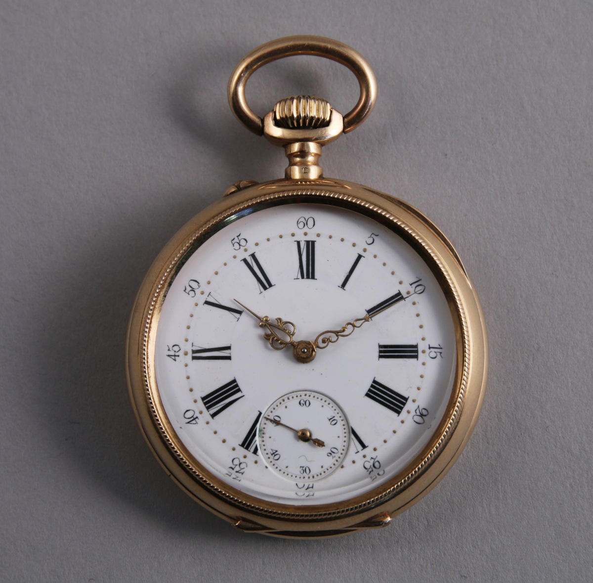 MONTRE de GOUSSET en or à remontoir au pendant. Le cadran émaillé blanc indique les heures en chiffres romains et les minutes en chiffres arabes, la trotteuse à six heures, les aiguilles finement ciselées. Le boîtier numéroté "5920". Échappement à cylindre.