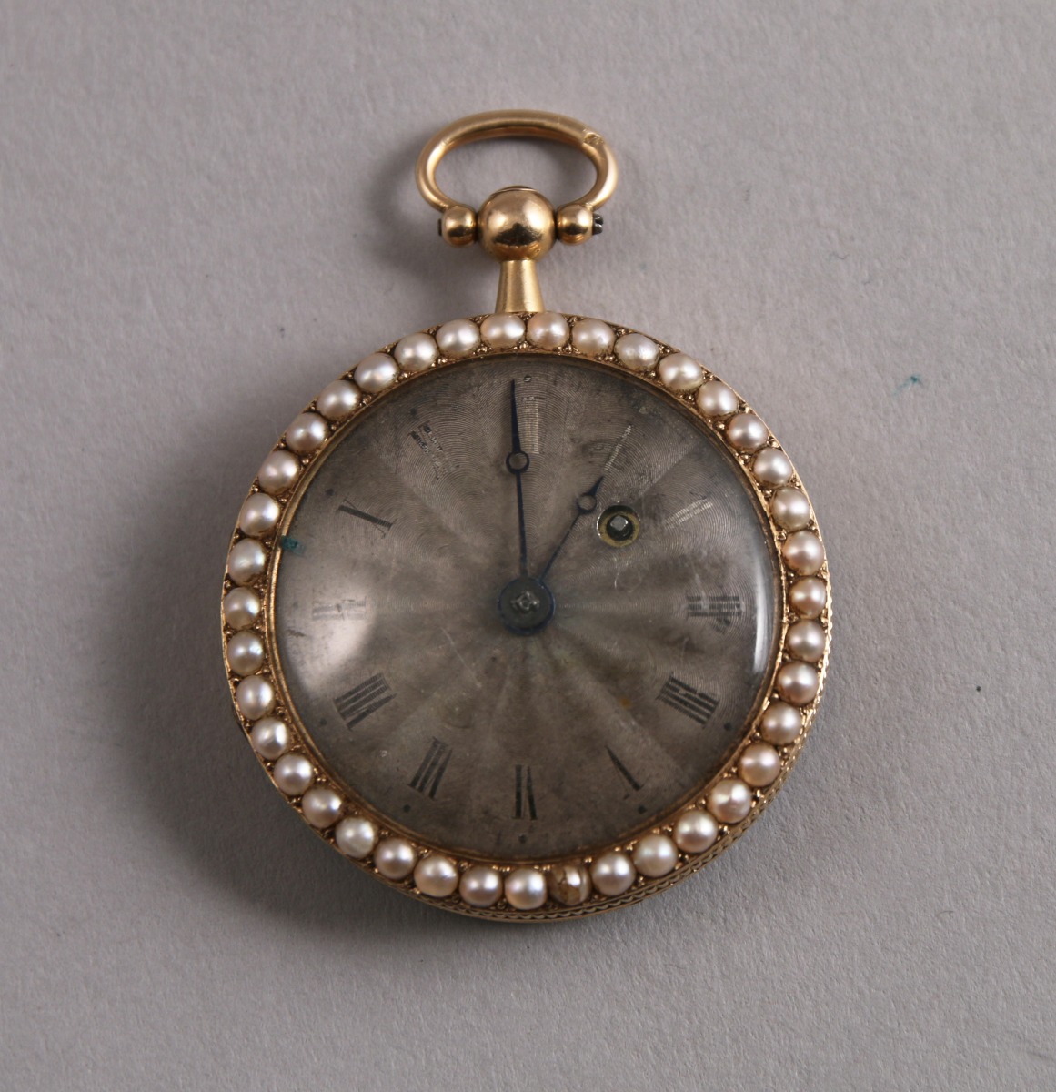 MONTRE de COL à COQ en or, à clef à double boitier. Le cadran argenté indique les heures en chiffres romains, les aiguilles en acier bleui. Les boîtiers à décor d'un entourage de demi perles, le dos à décor d'un soleil rayonnant. Mouvement au coq ajouré et ciselé, échappement à verge.