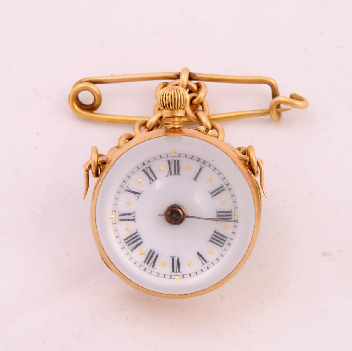 MONTRE BOULET à remontoir au pendant en or à verres bombés grossissants. Cadran émaillé blanc indiquant les heures en chriffres romains. Elle est retenue par deux chaînes réunies à une épingle à nourrice.