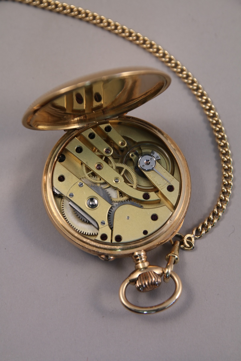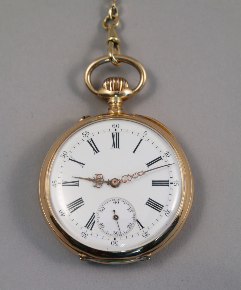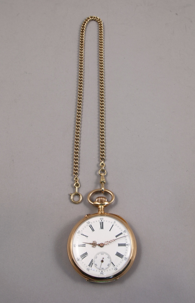 Avec une CHAÎNE GILETIÈRE à maille forcat en or jaune. Long. 345 mm. Poids 13,6 g.