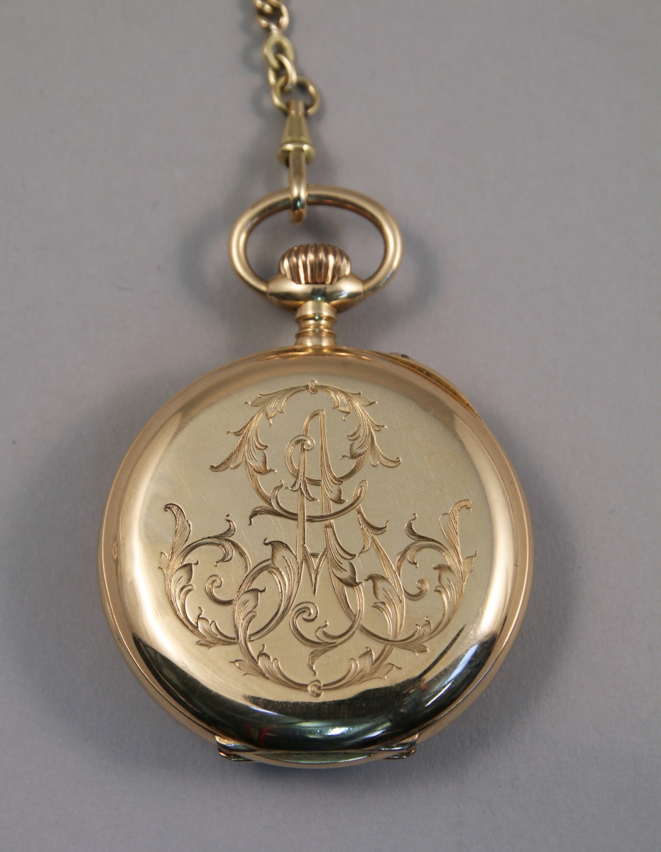 MONTRE de GOUSSET en or jaune au boîtier monogrammé "AG" avec remontoire à 12 heures. Double cadran émaillé, le plus gradué pour les minutes, les heures en chiffres romains et chaque période de cinq minutes en chiffre arabe, le plus petit avec la trotteuse des secondes.