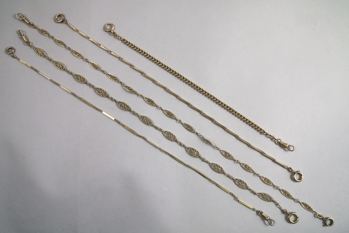 RÉUNION de 5 CHAÎNES GILETIÈRES en or à mailles et fermoirs à ressort.