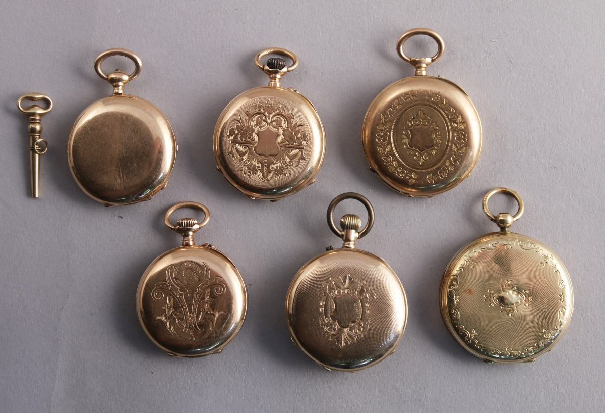 6 MONTRES de COL en or, à clef ou à remontoir au pendant. L'une à dos orné de motifs feuillagés signée "Chabault / à Blois", une autre avec sa clef en or. Une sans mécanisme. Une avec cache-poussière et anneau de bélère en métal.