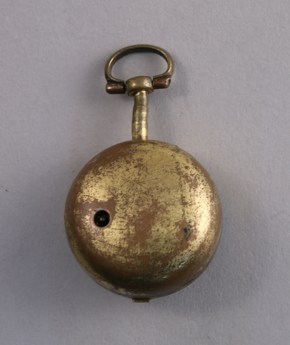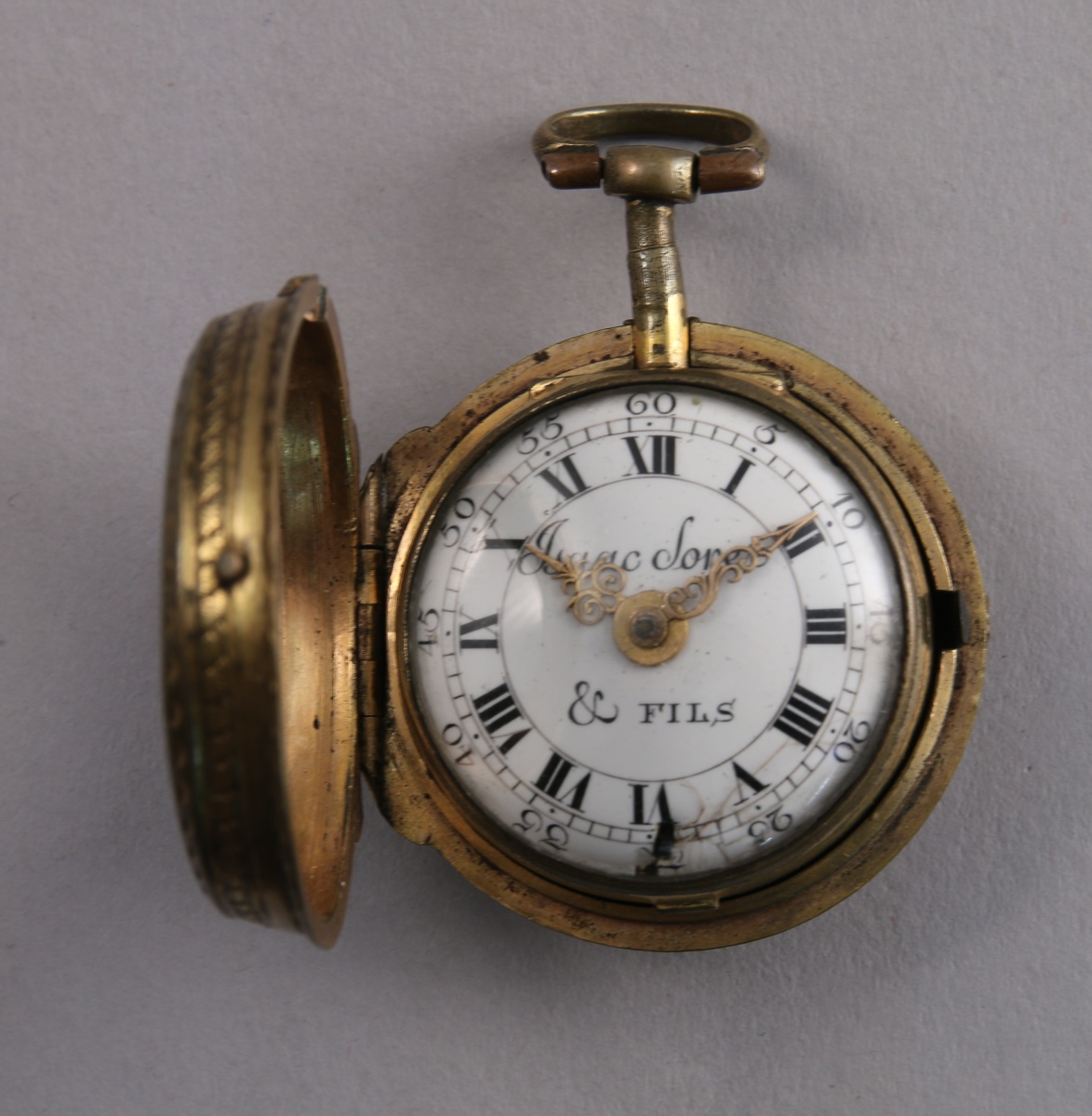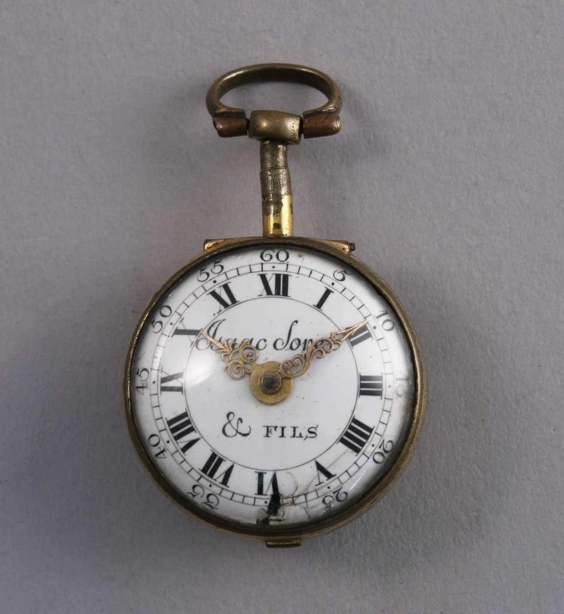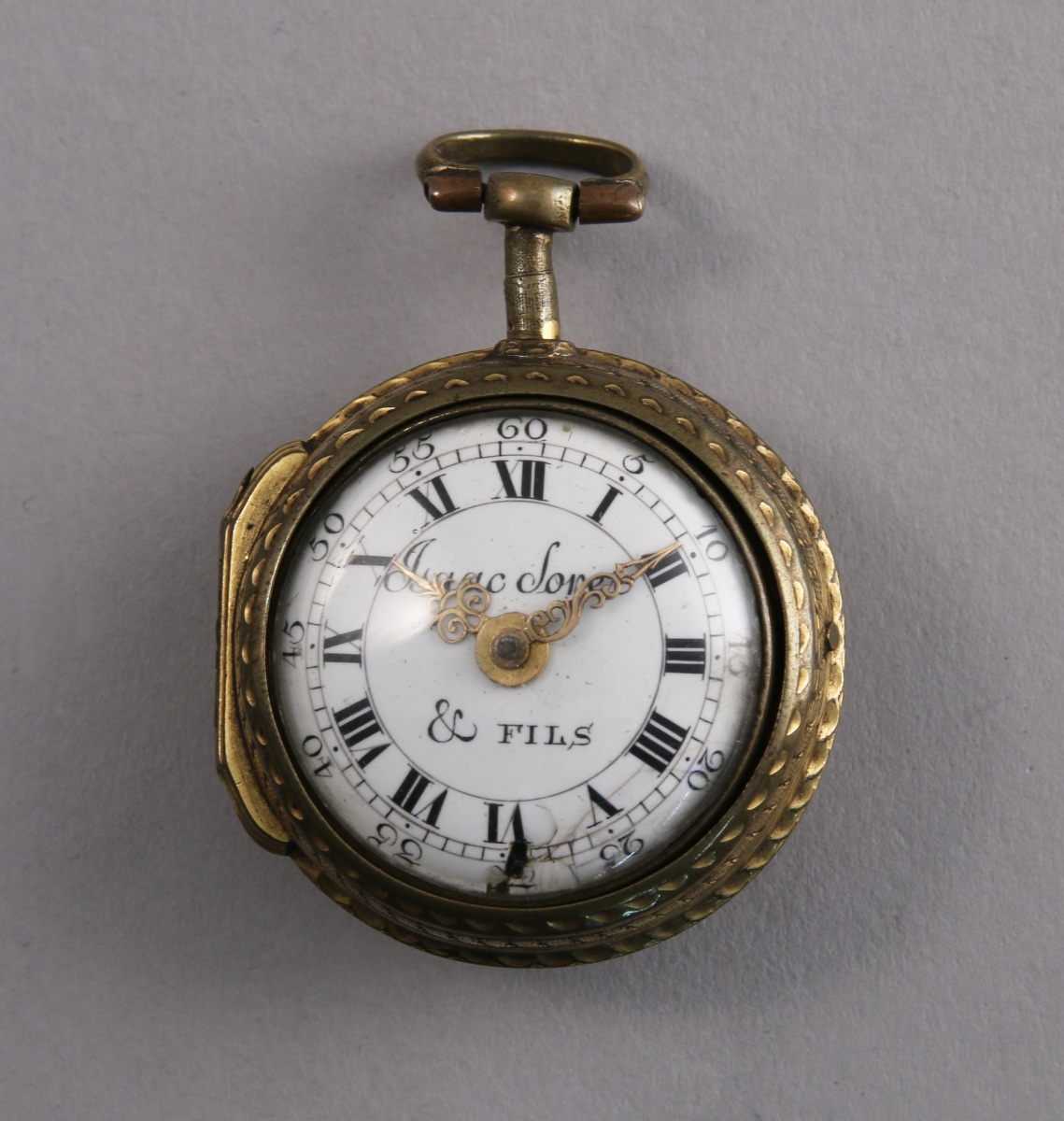 MONTRE de POCHE à COQ en laiton doré. Cadran émaillé blanc à chemin de fer indiquant les heures en chiffres romains et les minutes en chiffres arabes signé "Isaac Soret & fils". Le coq ciselé de rinceaux et d'un mascaron. Mouvement signé et numéroté 20517. Le boîtier porte le même numéro. Avec son boîtier de protection en laiton doré orné au dos d'un vase fleuri.