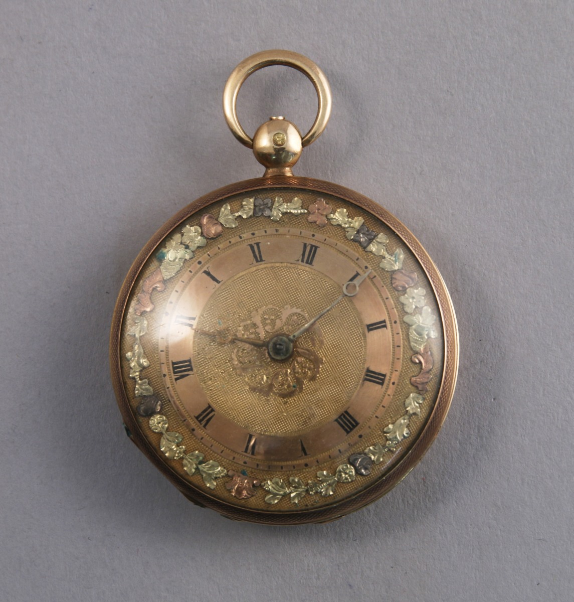 MONTRE de GOUSSET en or jaune, à clé. Le boitier guilloché. Le cadran en or deux tons gradué pour les minutes avec les heures en chiffres romains. Le mouvement orné d'un coqc en or jaune ajouré.